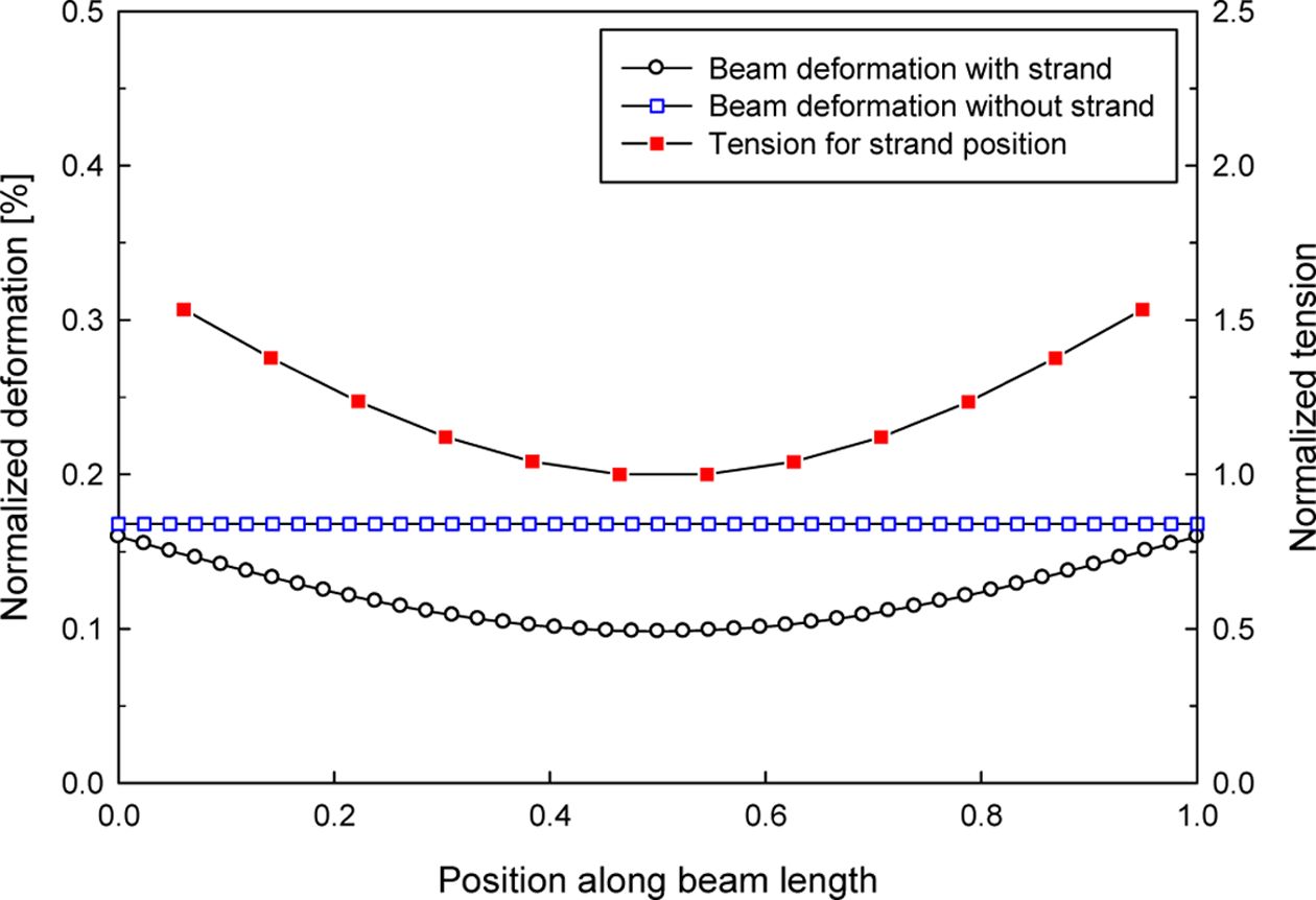 대해 각 시편의 길이방향에 따른 응력 분포가 나타나 있다. Fig. 6에서와 같이 빔의 변형과 개별 스트랜드 시편이 받는 인장은 빔의 중앙에 대해