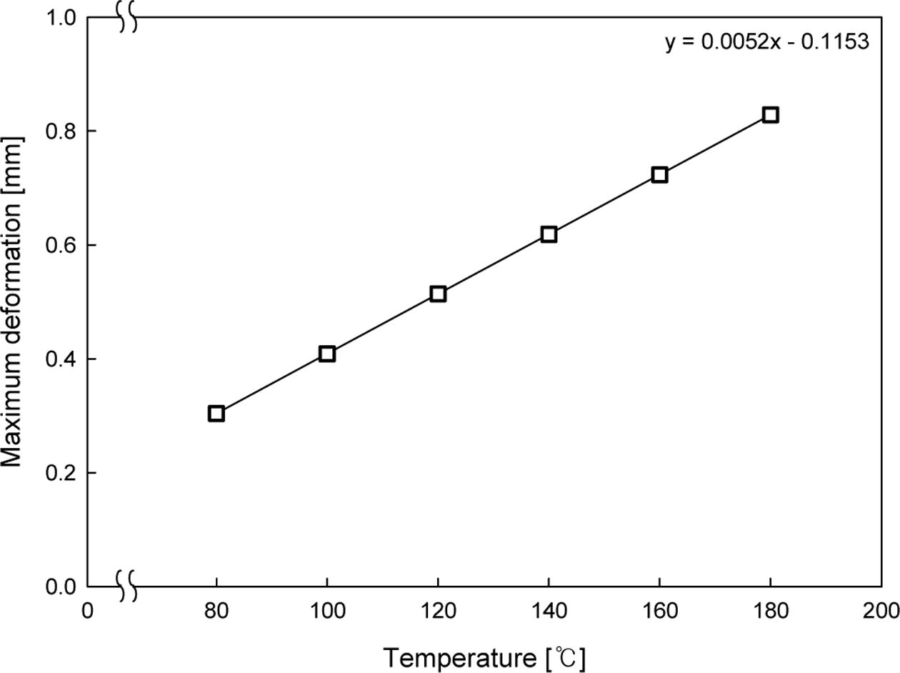Fig. 8은 경화 온도를 80~180°C까지 20°C 간격으로 해석한 경우 빔의 최대 변위를 온도에 대해 나타낸 것이다. 해석이 정적