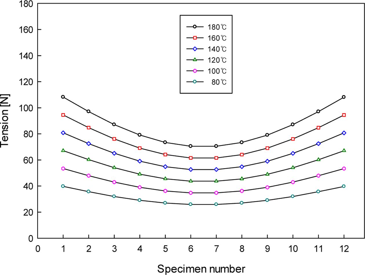 커짐을 알 수 있다. 개별 스트랜드 시편에 작용하는 장력도 Fig. 7에서와 같이 온도가 증가함에 따라 선형적으로 증가함을 알 수 있다. 따라서