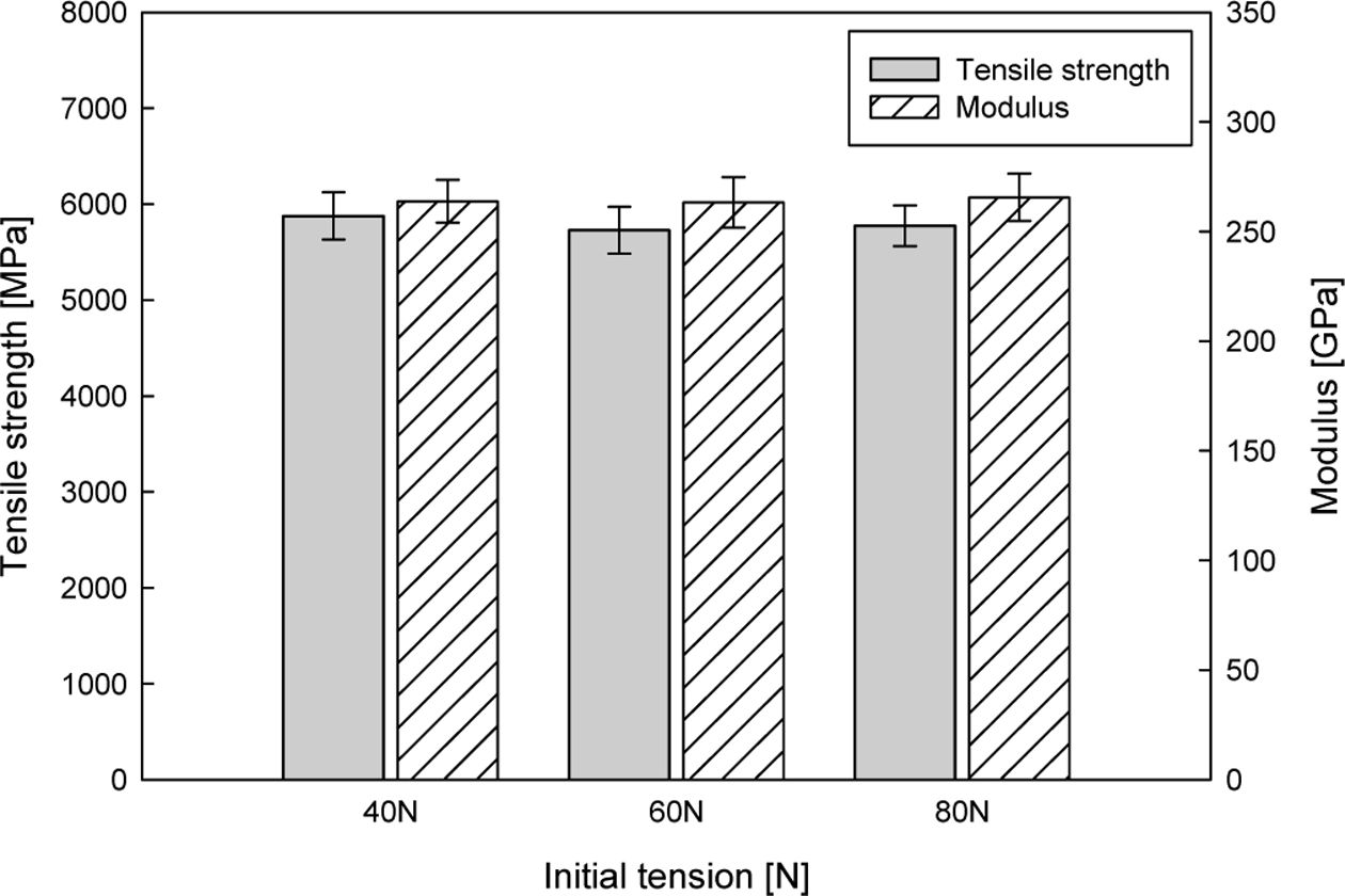 Fig. 10과 Fig. 11에는 초기 장력에 따른 인장강도와 탄성계수가 나타나