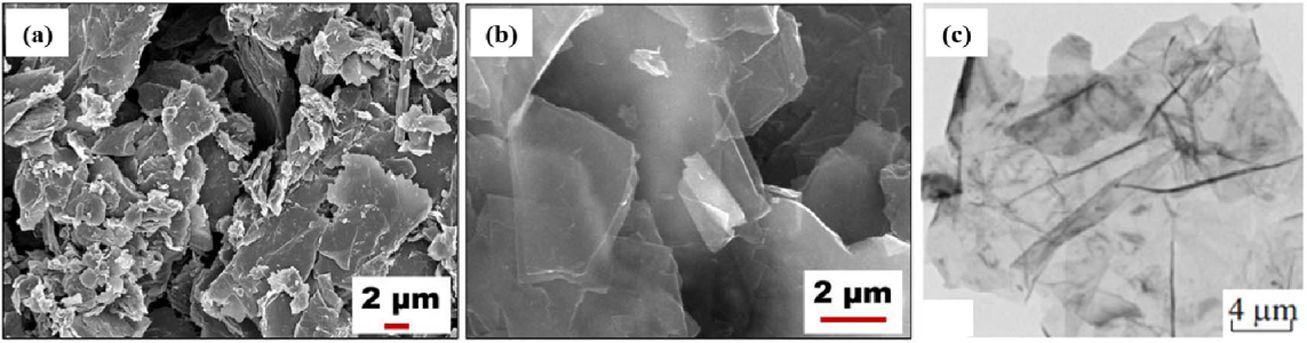 Fig. 1 SEM images of (a) graphite, (b) GNP and (c) TEM image of
