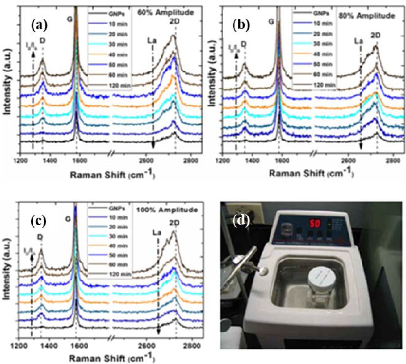 초음파법을 사용할 때에는 초음파 주파수, 전력 및 처리 시간을 재료에 맞게 적절히 적용해야 한다. 초음파 처리 조건이 과도할 경우 GnP 등의 입자가 크게 손상될 수 있기 때문이다. 이는 Fig. 3에서와 같이 Raman 스펙트럼 D 밴드의 강도 증가를 통해 확인할 있다[35,36].