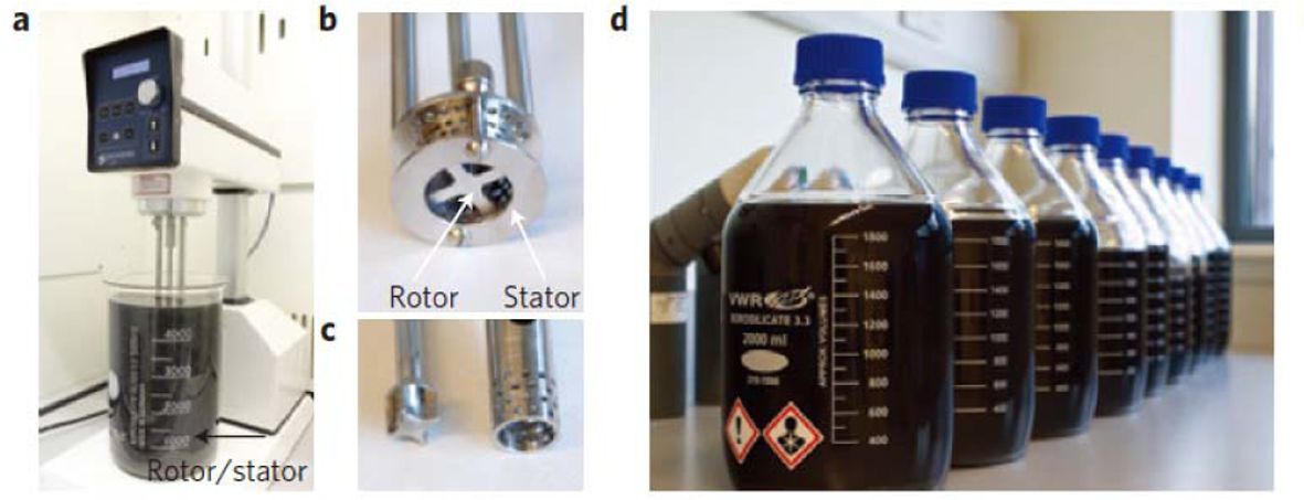 shear mixer, (b) a mixing head and (c) a rotor and a separated stator. (d) Graphene-NMP dispersions produced by