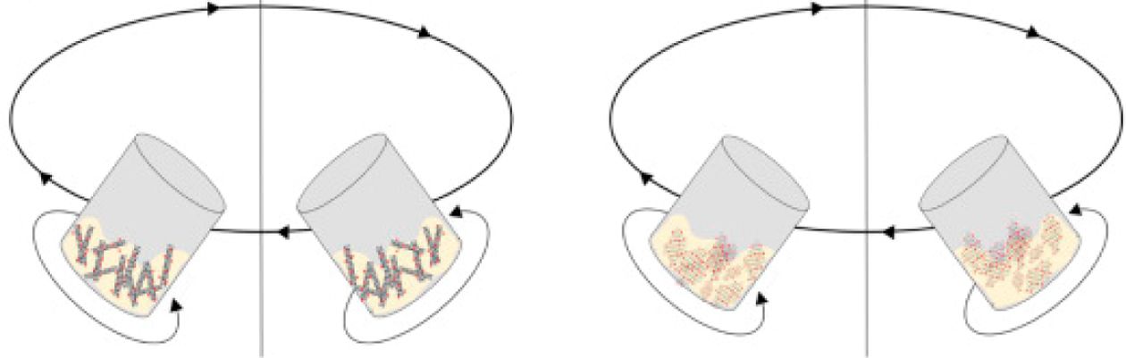유성 원심분리 혼합법(planetary centrifugal mixing)은 회전날을 사용하지 않고도 재료를 공전-자전-회전으로 교반 하면서 동시에 분해할 수 있는 방법이다. 공전(원심력으로 재료를 중심에서 멀리 이동) 및 회전(용기의 회전으로 재료를 흐르게 하면서 전단)을 45도 회전 축으로 기울여서 진행하면 3차원 흐름이 발생하게 된다. 이런 공전-회전 혼합기의 메커니즘은 재료의 공전(시계 방향)을 유지하고 용기가 스스로 회전(시계 반대 방향)하는 것으로 이러한 방법을 사용하면 진공 압축에 의한 공기제거 및 복합 재료에 대하여 높은 분산 효율을 얻을 수 있다[43]. 짧은 시간에 고점도 GnP 복합소재의 진공탈포 또는 분산을 할 수 있고, 비접촉식 방식이기때문에 타재료에 의한 오염도 방지할 수 있다[44]. 용기의 용량이 정해져 있어서 대용량의 샘플을 한꺼번에 처리하기 어렵다는 단점이 있다. Fig. 4 Fig. 6
