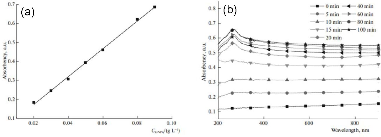 Fig. 9 . UV-visible analysis. (a) Calibration curve of GNPs in aqueous solution at λ = 260 nm and (b) Absorption spectra of