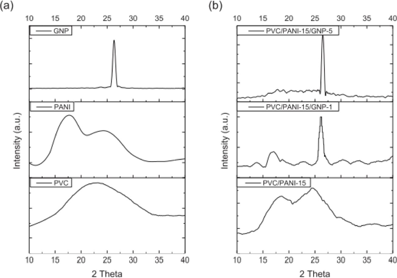 Fig. 10 XRD pattern of (a) GnP, PANI, PVC and (b) PVC/PANI