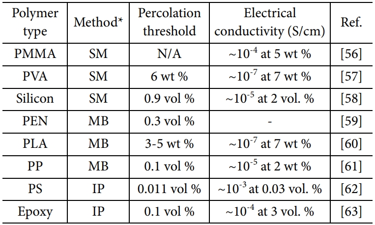 In-situ 중합법(in situ polymerization)은 주로 열경화성 수지(thermosetting plastic)을 제조하는 데 사용된다. 용액 내의 모노머 수지와 GnP를 미리 잘 분산시킨 혼합물을 만든 후, 자외선(UV) 또는 열(heat) 처리하여 고분자 수지 내에 공유결합 링크(covalent cross-linking)를 형성하게 하면서 경화시킨다[52,53]. 일반적으로 이 방법으로 사용되는 GnP/에폭시 수지는 우수한 기계적 강도를 나타낸다[54,55]. Table 1은 각 GnP/고분자 나노복합소재에 대한 예시 및 특성을 보여준다. Fig. 7