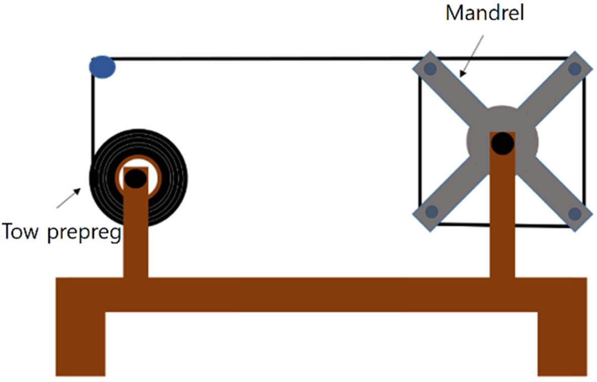 수지 함유량을 평가하기 위해 필라멘트 와인딩 공법에 적용되는 토우 프리프레그로 스트랜드 시편을 제작하였다. 시편에 사용된 탄소섬유(T800SC-24K, Toray, Japan)의 정보는 Table 1에 나타나 있다. 스트랜드 시편은 Fig. 1에 나타난 맨드렐이 장착된 자동 와인딩 장치를 사용하여 제작하였다. 먼저 수지가 함침 된 탄소섬유를 자동화 와인딩 장치 중 토우 고정부에 장착하고, 장력계(AP-10, Attonic, Japan)와 장력조절장치를 통해 탄소섬유에 규정된 장력이 적용되도록 하였다[6]. 맨드렐에 탄소섬유를 와인딩 하는 작업이 완료되면 회전축이 장착된 오븐에 맨드렐을 장착하고 1 rpm으로 회전시키며 규정된 경화 조건을 적용하여 경화시켰다. 스트랜드 시편은 경화 완료 후 시험에 필요한 규격에 맞게 절단하여 얻는다.