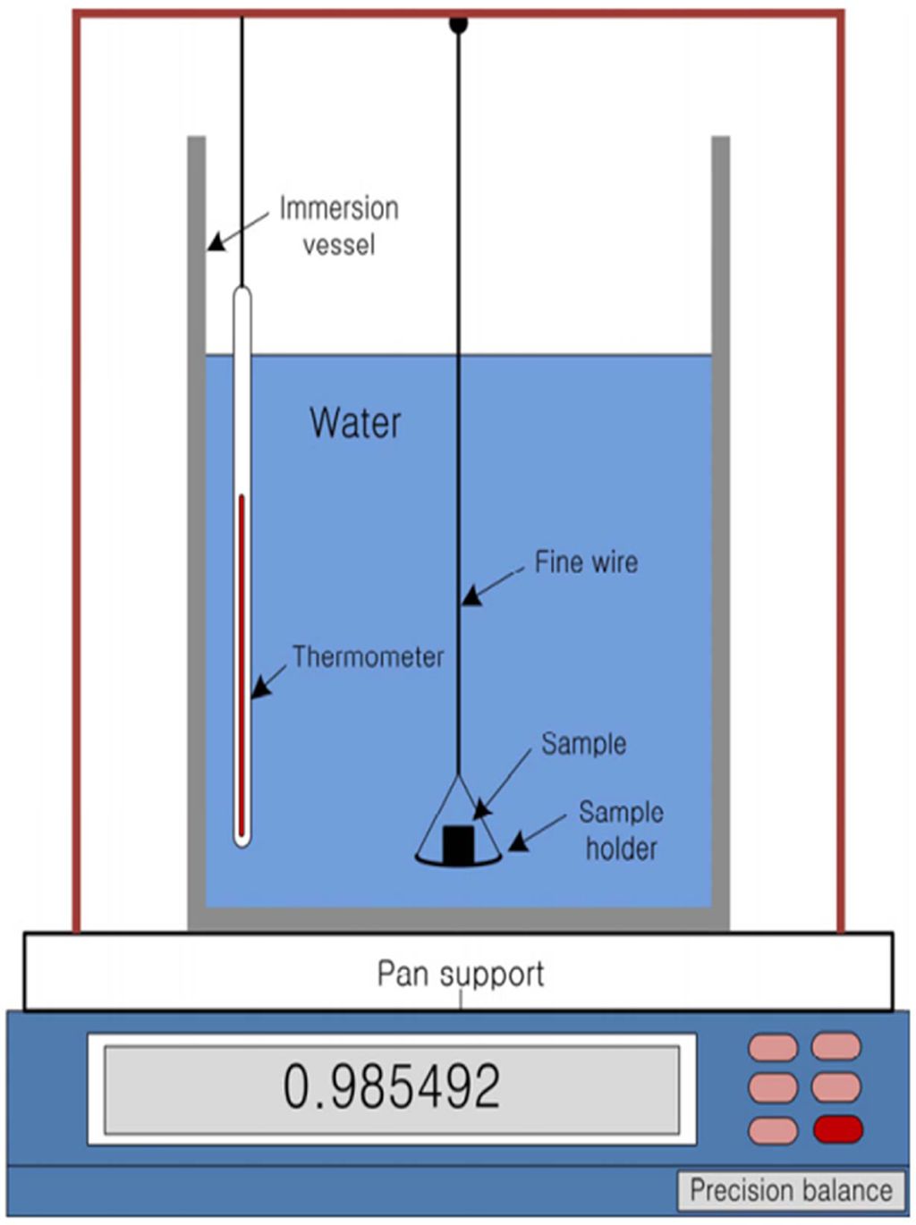 Fig. 2에는 밀도를 측정하기 위한 시험장치가 나타나 있다. 복합재와 탄소섬유의 밀도는 ASTM D792에 근거하여 다음과 같은 절차에 따라 수행하였다. 첫째, 밀도를 측정하고자 하는 시료의 공기 중의 무게를 측정한다. 둘째, 온도를 안정된 상태로 유지시킨 다음 물의 온도와 물속에서의 시료의 무게를 측정한다. 이때 시료의 표면에 기포가 달라붙지 않도록 초음파 분산기를 사용하여 기포를 제거한다.