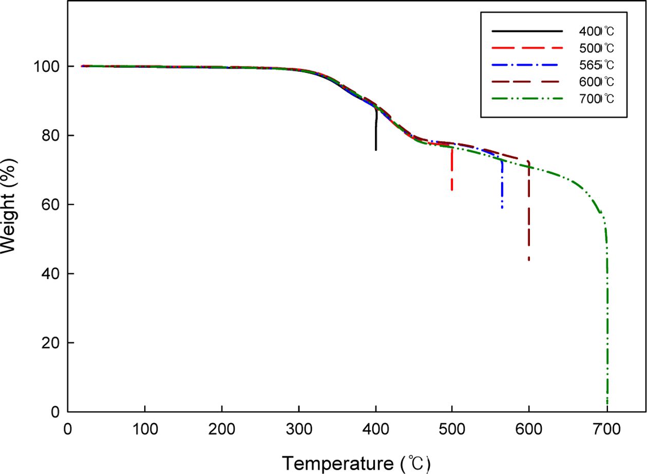 복합재 구성재의 함유율을 평가하기 위해 4종류의 시료에 대해 온도 변화와 노출 시간에 따른 시료의 무게 변화를 측정하는 분석 장비인 열중량분석기를 적용하였다. 열중량분석기를 적용한 고온 연소법은 머플로를 적용한 고온 연소법과 유사하지만, 시험 과정에서 시료의 무게를 실시간으로 측정하므로 노출 시간에 따른 무게 변화를 얻을 수 있다. 복합재 구성재의 함유율을 평가하기 위해 시험은 4 ml/min로 공급되는 질소(순도 99.5%) 분위기에서 약 5 mg의 시료에 대해 20oC/min로 규정된 온도까지 승온 시켰다. 머플로를 적용한 고온 연소법과 동일하게 열중량분석기에서 측정된 무게를 식 (1)-(5)에 적용하여 복합재 구성재의 무게 함유율과 부피 함유율을 평가하였다.