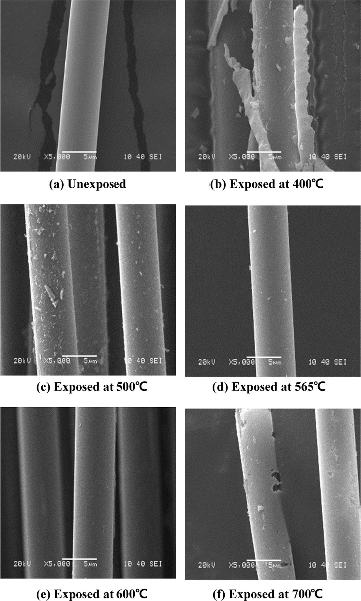 Fig. 4에는 수지 제거 상태와 탄소섬유의 열 손상 여부를 전자현미경으로 관찰한 설정 온도 별 사진들이 나타나 있다. 여기에서 보면 400oC에서는 수지가 완전히 제거되지 않고 남아 있는 양상이 관찰되었다. 또한 500oC과 565oC에서는 대부분의 수지가 제거되었으며 부분적으로 일부 수지가 남아 있지만 최종 무게에 영향을 미치지 않을 것으로 판단된다. 그러나 600oC에서는 탄소섬유 표면의 일부에서 열 손상이 관찰되었고 700oC에서는 탄소섬유의 넓은 부위에서 열 손상이 관찰되었다. 따라서 전자현미경을 통해 관찰된 수지 제거 상태와 탄소섬유 손상 여부로 판단하면 탄소섬유의 열 손상을 발생시키지 않고 수지만을 제거하기 위해서는 565oC를 적용하는 것이 바람직함을 알 수 있다.