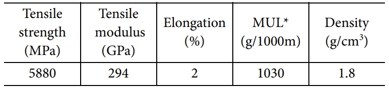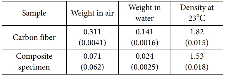 Table 2에는 스트랜드 시편에서 채취된 5개의 시료에 대해 측정된 밀도가 나타나 있다. 이때 물의 온도는 23.9oC로 물의 밀도는 0.9973 g/cm3을 적용하였다. 여기에서 보면 제조사에서 제공된 탄소섬유의 밀도는 1.80 g/cm3이고 시험을 통해 측정된 결과는 1.82 g/cm3이다.