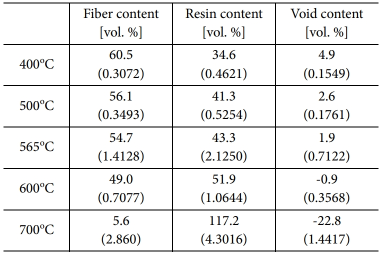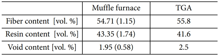 Table 5에는 머플로와 열중량분석기를 적용한 고온 연소법으로 탄소섬유가 손상되지 않고 수지만을 제거 시킬 수 있는 온도인 565oC에서 평가된 구성재의 함유율이 나타나 있다. 여기에서 보면 열중량분석기를 적용한 고온 연소법에서 측정된 수지 함유량은 머플로를 적용한 고온 연소법에 비해 동일한 시험 조건에서 2 vol.% 정도 낮다. 일반적으로 500oC 이상에서 노출되는 탄소섬유의 표면에는 산화 반응으로 인해 열 손상이 발생하기 시작되지만 565oC에 노출된 탄소섬유의 표면에 발생된 열 손상은 전자현미경으로 확인하기 어려운 정도이고 시료 무게에 대한 무게 감소 정도도 크지 않을 것으로 판단된다. 이와 같이 열중량분석기를 적용한 고온 연소법은 소량의 시료로도 정량적인 시험이 가능하며 최적의 설정 온도와 노출 시간을 제어하면 효율적으로 복합재 구성재의 함유량을 평가할 수 있다.