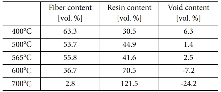 Table 3에는 머플로를 적용한 고온 연소법으로 평가된 설정 온도 별 탄소섬유/에폭시 복합재 구성재의 함유율이 나타나 있다. 여기에서 보면 온도가 높아질수록 제거된 수지 양이 많아 평가되는 수지 함유량은 점차 높아지고 섬유 함유량은 점차 감소하는 양상을 나타낸다. 특히 600oC 이상의 온도에서 장시간 노출되면 섬유 함유량과 수지 함유량의 합이 100 vol. %가 넘는 것으로 미루어 600oC 이상에서는 탄소섬유가 고온으로 인한 열 손상을 받는 것으로 판단된다. 그러나 무게 감소 정도로는 수지 제거 상태와 탄소섬유의 열 손상 여부는 판단하기 어렵다.