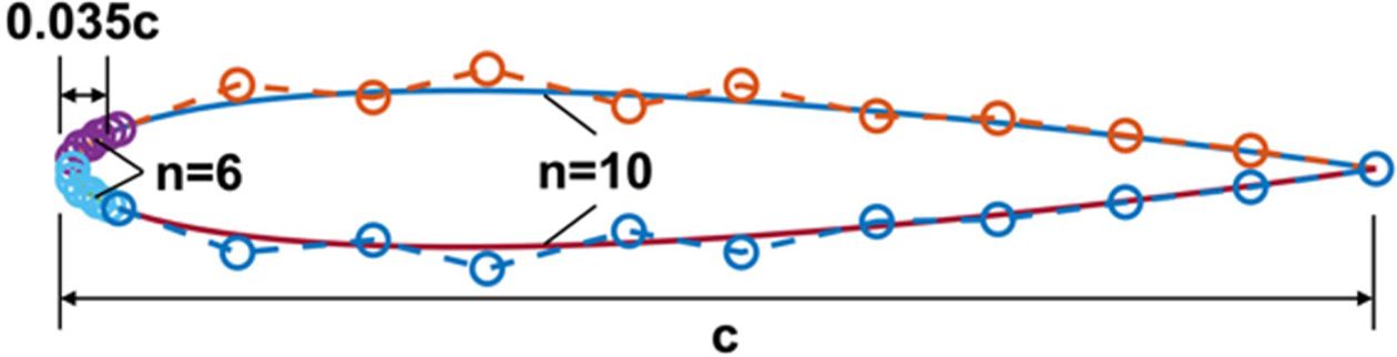 Fig. 1은 NACA0012 에어포일의 외형을 Bézier 곡선으로 나타낸 것이다. 앞전부근에서 곡률이 급격히 변하므로, 윗면 아랫면 각각 0.035c(c: 시위길이) 지점을 기준으로 곡선을 두 개로 구분하였다. 0.035c 기준으로 왼쪽의 곡선들은 6차, 오른쪽의 곡선들은 10차의 Bézier 곡선을 이용하여 표현하였다.