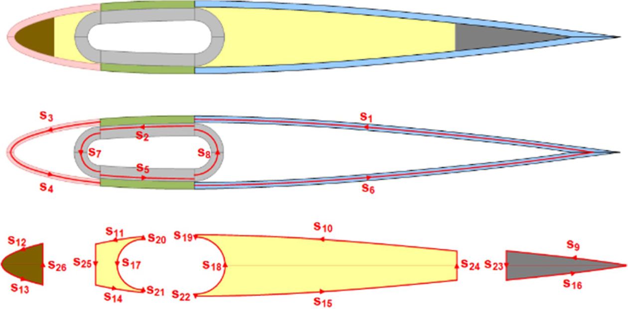 한편, 중심선(contour) 기반의 단면해석법[9-14]은 속이 빈 박벽(thin-walled) 블레이드의 단면해석에 사용하기 적합한 방법으로, 단면 벽을 1차원 곡선으로 근사화하고, 이들을 단순 선적분하여 블레이드의 단면 물성을 계산하는 방법이다. 블레이드를 구성하는 각각의 벽을 1차원적인 선으로 모델링하여 해석을 수행하므로 2차원 유한요소기반 단면해석법에 비해 효율적인 단면 모델링 및 해석이 가능하다. 그러나, 2차원 유한요소기반 단면해석법에 비해, 고형(solid) 블레이드 단면에 대해서는 해석이 어려우며, 중심선의 수학적 표현식을 도출하기가 쉽지 않다는 단점이 있다. 이러한 문제점을 극복하기 위해, 일부 선행연구[11,13,14]에서는 임의의 곡률을 갖는 단면의 중심선들을 수학적으로 표현하기 쉬운 여러 개의 직선 세그먼트(segment)로 이산화하여 모델링하는 방법을 제안한 바 있다. 선 세그먼트 기반의 접근법은 임의의 곡률을 갖는 곡선을 효과적으로 모델링하는 것이 가능하나, 반복적인 내부형상변경(단면 벽의 두께 등)이 요구되는 최적설계 프레임워크에 적용하기에는 비효율적인 측면이 있다.