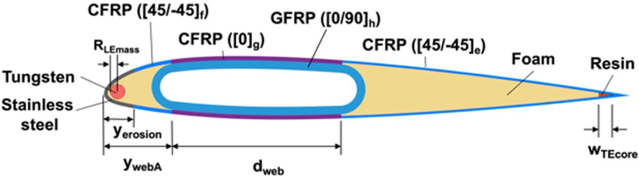 기준 단면형상을 참고하여 Fig. 4와 같이 설계변수들을 설정하였다. 설계변수는 외피 및 스파 복합재의 적층수, 앞전 erosion shield와 뒷전 레진보강재의 폭, 전단웹의 위치 등으로 구성된다.