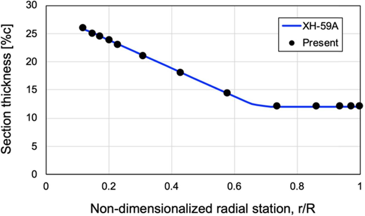 본 연구에서 제안한 단면해석 기법의 효율성을 확인하기 위해, 미국 Sikorsky사에서 제작된 동축반전 헬리콥터인 XH-59A의 블레이드를 활용하여 단면 최적 구조 설계를 수행하였다. 참고문헌[16]에 제시된 데이터를 토대로 계산된 XH-59A의 블레이드의 질량은 152 kg이며, 블레이드의 공진회피조건을 만족함과 동시에 무게가 감소된 블레이드의 획득을 목표로 하였다.