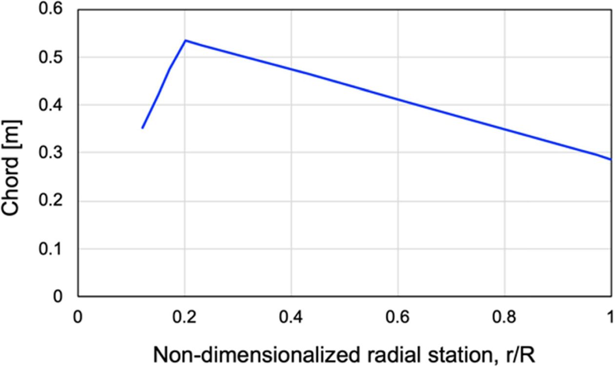 단면의 두께분포와 시위길이 분포는 각각 Fig. 5 및 6과 같다. 참고문헌[7]을 참고하여 0.12R부터 0.73R까지의 단면에는 NACA00xx 계열 에어포일을, 0.73R 이후 지점의 단면에는 NACA23012 에어포일을 이용하였다. 단면의 초기비틀림각 분포는 참고문헌[16]의 데이터를 그대로 이용하였다. 단면에 사용된 재료들의 주요 물성치는 Table 1에 정리되어 있다. Stainless steel의 물성치는 참고문헌 [6]의 데이터를 이용하였다.
