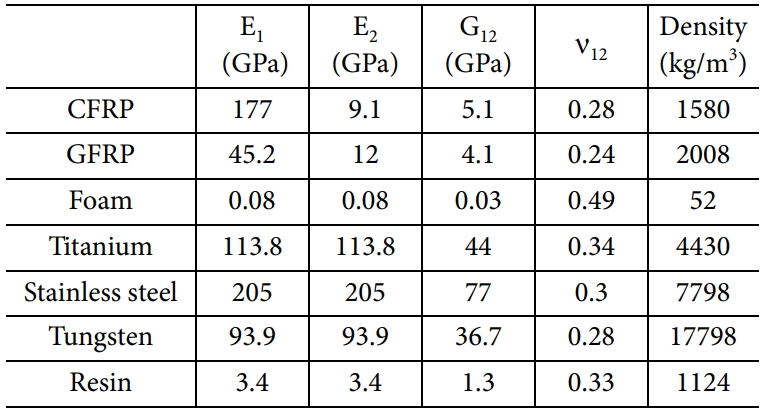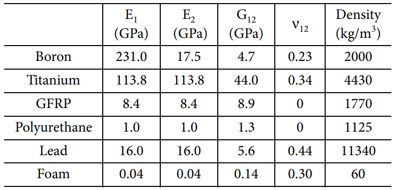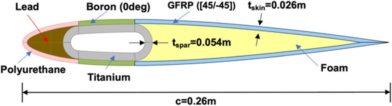 제안한 단면 모델링 기법의 신뢰성을 검증하기 위해 임의의 블레이드 단면에 대하여 검증을 수행하였다. 단면형상과 재료분포를 나타내면 Fig. 7과 같다. 단면의 외형은 NACA0012 에어포일을 이용하여 생성하였다. 외피에는 앞전에서부터 polyurethane, boron, GFRP 등이 사용되었다. GFRP는 [45/-45]로 적층된 라미네이트(laminate)의 등가물성을 이용하였다[3]. 심재는 앞전의 납(lead)과 뒷전의 폼(foam)으로 구성된다. 재료들의 주요 물성치를 표로 나타내면 Table 2와 같다. Boron, polyurethane의 물성은 각각 참고문헌 [19]와 [20]의 데이터를 이용하였다. Titanium은 Table 1에 제시된 물성을 이용하였다. 이외 나머지 재료들의 물성은 참고문헌[3]의 값을 이용하였다.