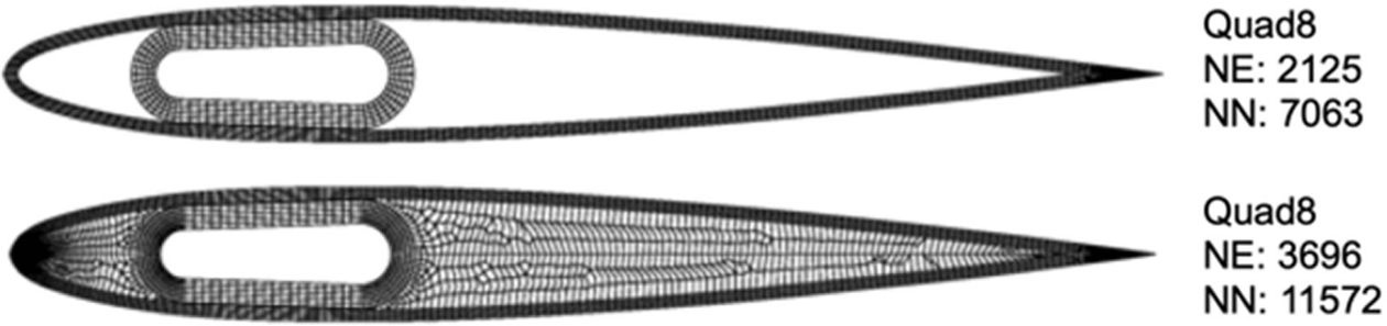 2차원 유한요소기반 단면해석법[1-5]은 2차원 평면유한요소를 이용하여 이산화 된 단면의 주요 물성을 도출하는 방식이다. 이 방법을 이용할 경우 모델링 가능한 형상 및 재료분포에 제약이 없기 때문에, 대부분의 블레이드 단면 구조설계 연구들[6-8]이 이 방법을 이용하고 있다. 하지만, 최적설계 프레임워크 구축 과정에서 반복적인 단면해석을 위한 자동화된 유한요소모델링과정 구축에 많은 준비작업이 필요하고 계산시간이 많이 소요되는 단점이 있다.