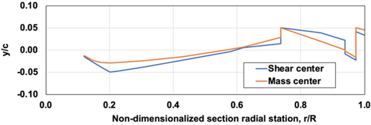 Fig. 9는 블레이드 단면의 전단중심과 질량중심의 위치를 공력중심 기준으로 나타낸 것이다. 에어포일 영역의 모든 단면에서 주요 중심치 구속조건을 모두 만족하는 것을 확인할 수 있다.