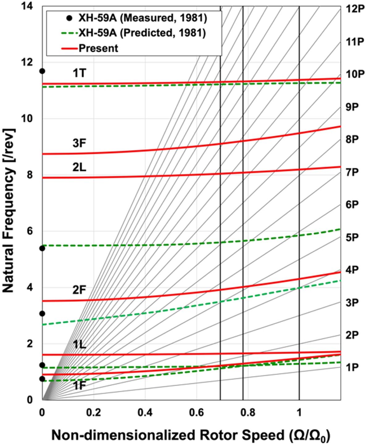 여기서 x는 설계변수 벡터를 의미한다. m은 블레이드의 질량, m0는 기준형상의 m을 나타낸다. 식 (10)부터 (12)까지는 로터의 공진회피조건을 나타낸다. N은 로터 회전수의 정수배수를 의미한다. ωi, ωj 및 ωk는 제자리 비행 시 로터 회전수의 69%, 78% 및 100%에서의 블레이드의 주요 회전고유진동수(1, 2, 3차 플랩(flap)모드, 1, 2차 래그(lag), 1차 비틀림 모드)들을 의미한다. ysc, ymc 및 yac는 각각 단면의 앞전 기준 전단중심, 질량중심 및 공력중심의 시위방향 위치이다. IR은 블레이드의 익근(root)을 기준으로 한 굽힘축기준 관성모멘트이며, 상첨자 0이 붙은 값은 기준형상의 값(548.43 kgm2)을 의미한다. δ는 블레이드의 끝단에 작용한 단위전단하중에 의한 블레이드의 끝단 변위이며, 상첨자 0이 붙은 값은 기준형상의 값을 의미한다. 단위 전단하중에 의한 끝단 변위확인 시, 블레이드의 익근에는 외팔보(cantilever)조건을 적용하였으며, 기준 블레이드의 끝단변위는 1.58×10-4 m이다.