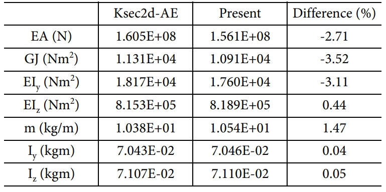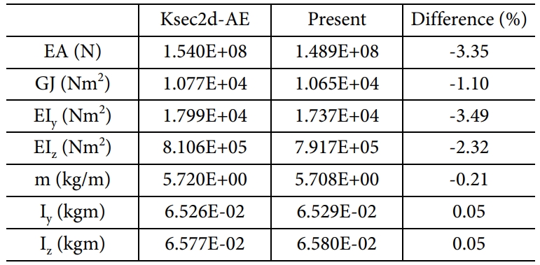 Table 3과 4는 각각 심재가 미 포함 및 포함된 단면에 대한 해석결과를 비교한 것이다. 강성 비교는 축강성(EA), 비틀림강성(GJ), 그리고 굽힙강성(EIy, EIz)에 대해 진행하였고, 관성치는 블레이드의 단위길이당 질량(m), 그리고 y축과 z축에 대한 관성모멘트(Iy, Iz)를 비교하였다. 상대오차는 Ksec2d-AE의 결과를 기준값으로 설정하여 계산하였다. 심재가 미 포함된 경우 해석코드 간 최대오차가 약 3.49%, 심재가 포함된 경우, 두 해석 코드 간 최대오차가 약 3.52%임을 확인하여, 본 연구에서 개발된 해석코드의 유효성을 확인할 수 있었다.