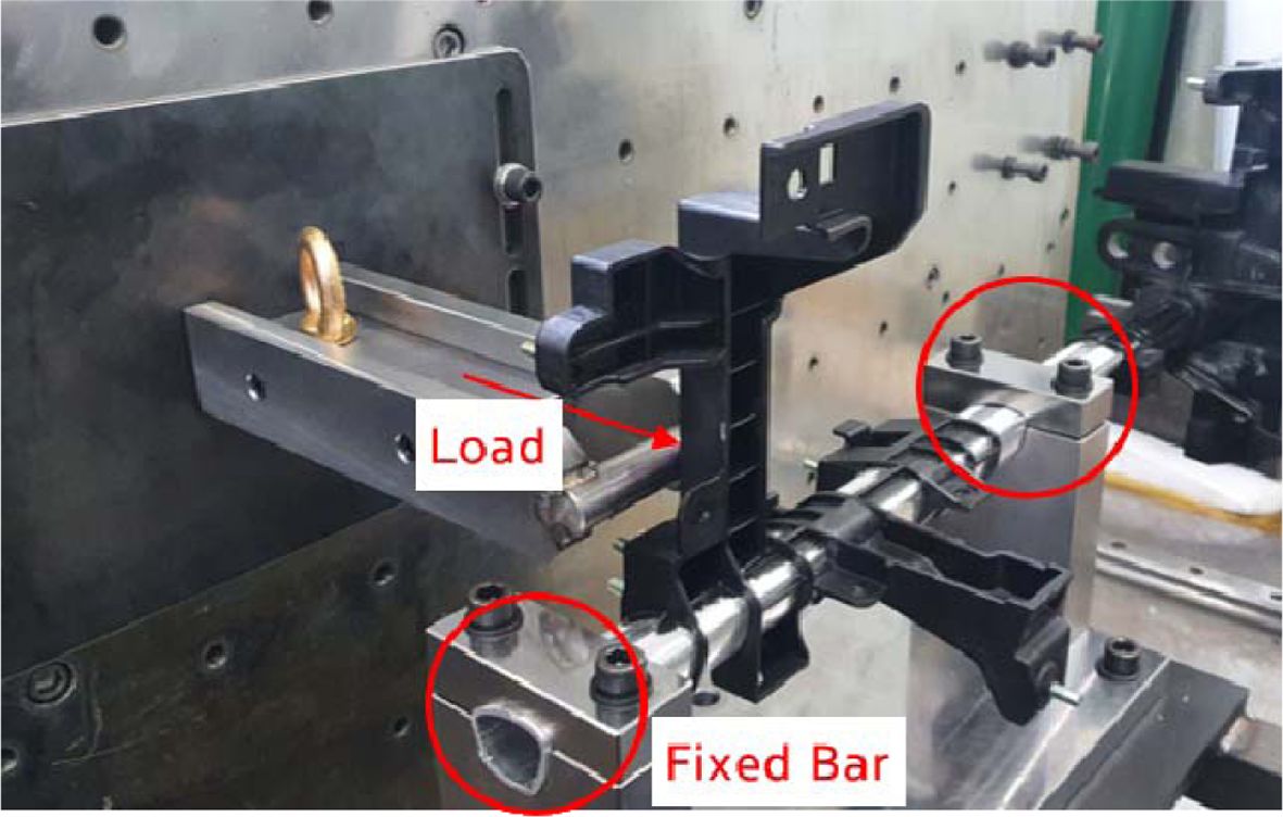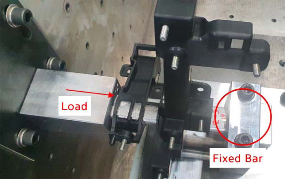 복합소재 알루미늄 인서트 바의 접합강도 시험를 위해 횡방향에 의한 접합 강도시험과 복합재 사출파트의 회전을 통한 회전에 의한 접합강도시험으로 시험평가를 수행하였다. 횡방향 접합 강도시험은 Fig. 5와 같이 알루미늄 바를 고정하고 횡방향(알루미늄 바의 면방향)으로 하중을 부여하였고, 회전강도 시험은 Fig. 6와 같이 알루미늄 바의 양쪽을 고정하고 복합재 사출부품에 하중을 주어 회전 접합강도 시험을 분석하였다.