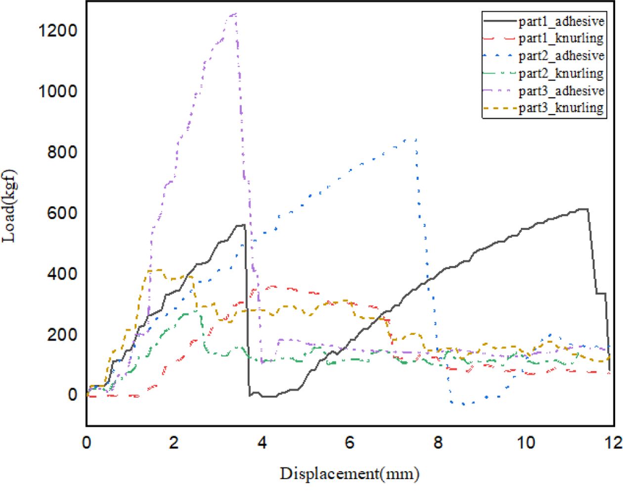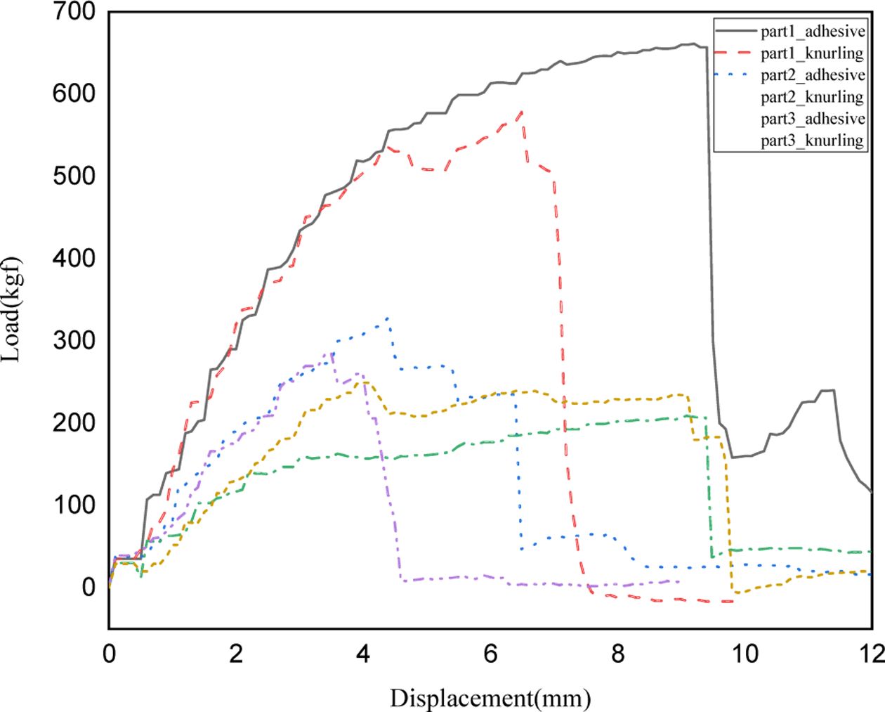 전체적으로 접합면적이 많은 파트에서 접착제에 의한 효과가 높게 나타나며, 널링보다 접착제 효과가 높게 나타난다. 이는 최대하중을 기준으로 접합 면적에 대한 접합력을 고려할 때, 접착제의 효과가 일정하게 나타남을 알 수 있다.