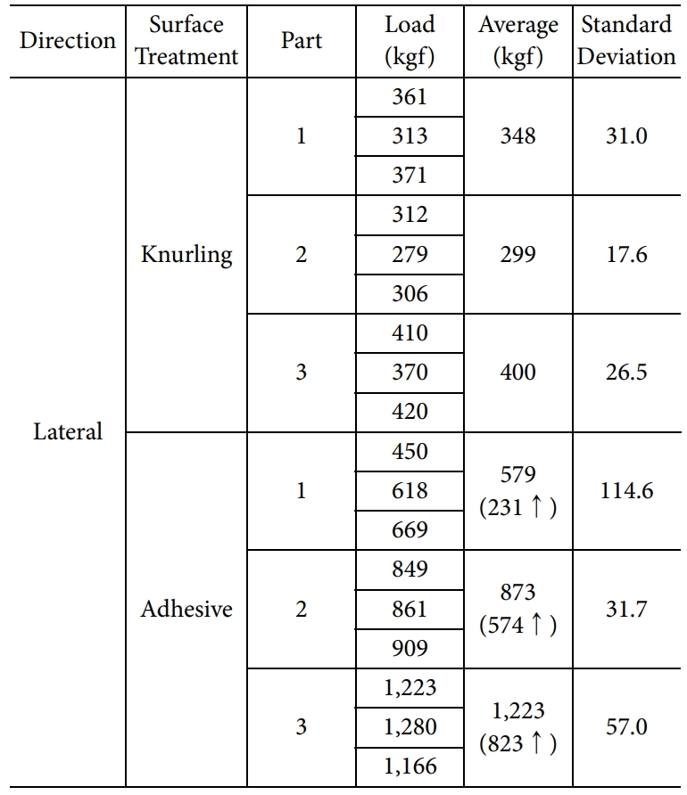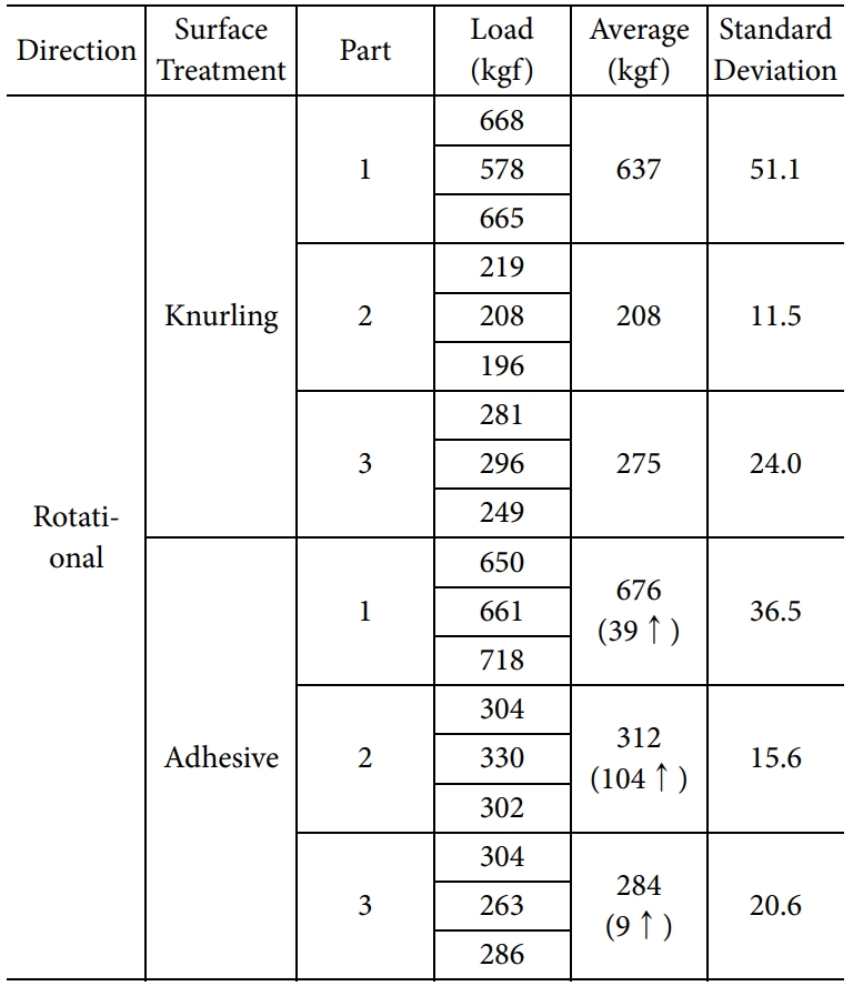 널링 표면처리의 경우, 접합력에 대한 균일한 특성을 보이지 않고 있다. 이는 널링처리에 의한 접합이 일정하게 접합되지 않고, 공정에서 일정한 품질을 확보하기가 어려운 것을 알 수 있다. 시험에 따른 오차범위, 표준편차를 고려하였을 때 평균대비 최대 7% 이내(회전방향 평균 287, 표준편차 20.6 ; 횡방향 파트1 제외)에서 시험결과가 나타나므로 부품 제조상의 문제라고 판단하기는 어렵다.