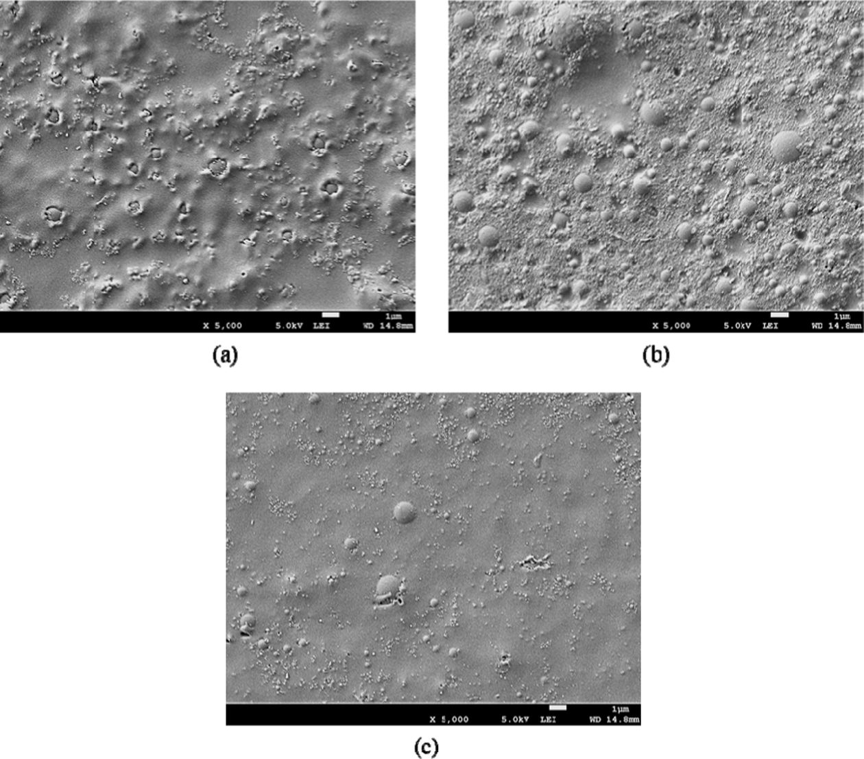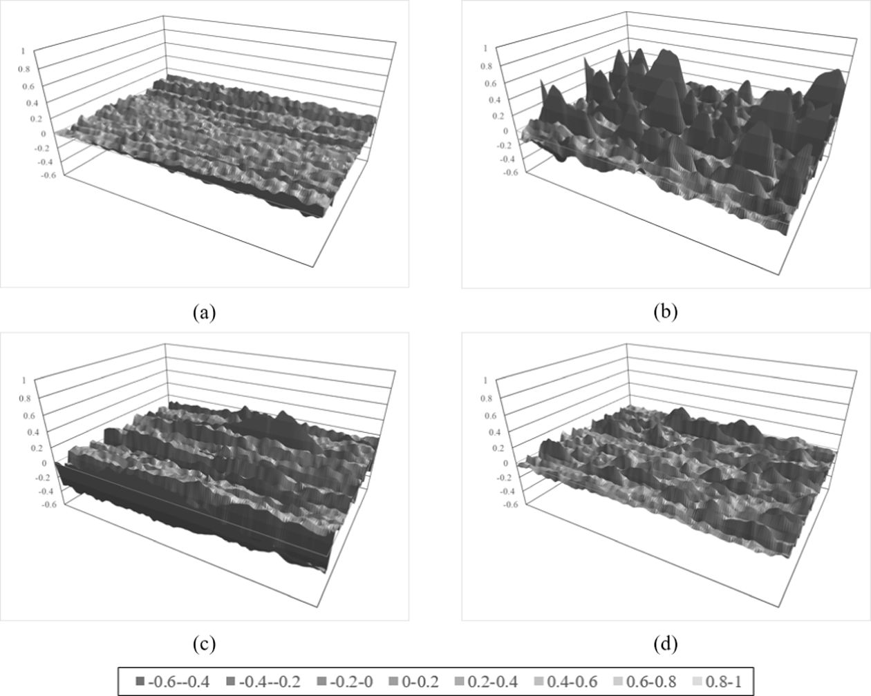Fig. 4는 2차원적인 거칠기 측정 결과를 이용하여 3차원 맵핑을 통해 시각화한 결과이다. 이를 통해 거칠기의 분포 및 크기를 보다 직관적으로 확인이 가능함을 확인하였다. 선경화가 없는 경우와 90분 동안 선경화 한 시편의 경우 표면 거칠기의 차이 및 분포가 거의 없는 것을 확인하였다. 그러나 30분 동안 선경화를 진행한 경우 거칠기의 분포가 60분 동안 선경화한 시편에 비해 매우 큰 것을 확인하였고, 이를 통하여 두 조건 간 Rz의 차이가 큰 것을 한 번 더 확인할 수 있었다. 이는 30분 선경화 조건에서 폴리우레탄 탑코트의 점도가 60분 선경화 조건에 비해 비교적 묽어서 발생된 결과임을 확인하였다. 실리카/에탄올 희석액이 코팅 후, 에탄올이 휘발되면서 실리카 나노입자가 폴리우레탄 탑코트에 고착되게 되는데, 비교적 점도가 낮은 30분 선경화 조건에서 실리카 나노입자가 서로 응집됨에 따라 최대 거칠기는 증가하고, 거칠기 분포는 감소되는 것을 확인하였다.