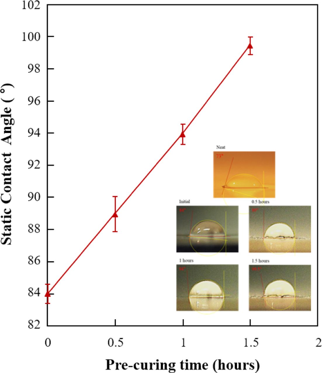 Fig. 5는 각기 다른 폴리우레탄 탑코트의 선경화 시간에 따른 증류수의 정적접촉각 결과이다. 표면거칠기의 경우 60분 선경화 조건을 기점으로 변곡점이 발생하는 것을 확인하였으나, 정적접촉각의 경우 선경화 시간이 길어짐에 따라 점차적으로 증가되는 것을 확인할 수 있었다. 60분 이후의 선경화 조건에서 표면 거칠기와 정적접촉각의 경향이 다르게 나오는 것을 확인할 수 있었고, 이는 실리카가 제대로 고착되지 않아 발생한 결과임을 확인하였다.