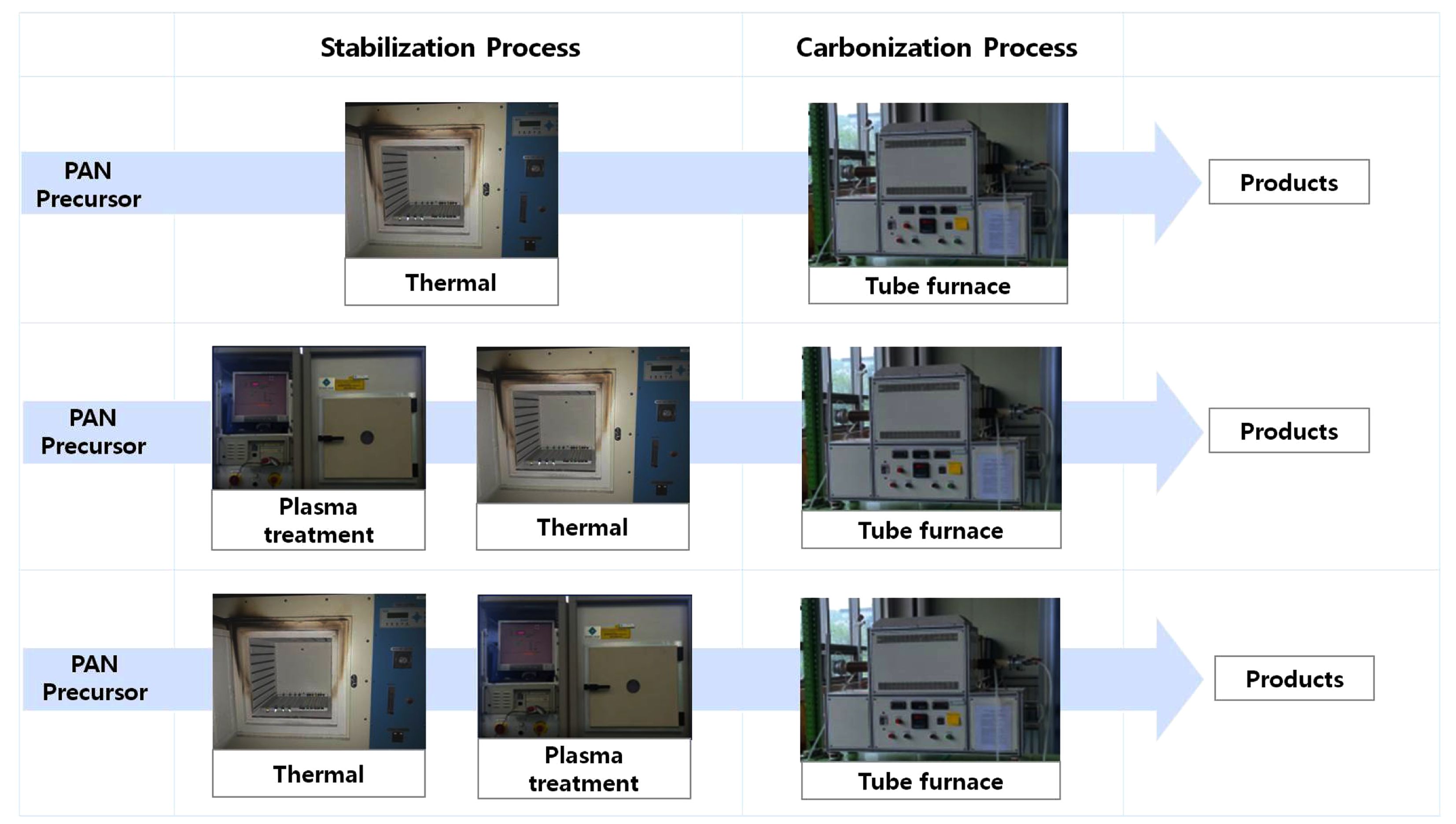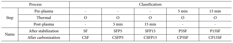 실험 재료로는 습식 방사를 이용하여 필라멘트로 방사된 PAN 전구체(12K, Jilin Tangu Carbon Fiber Co., China)를 사용하였다. 안정화는 열과 플라즈마 처리를 함께 진행하였으며, 열 안정화 공정은 박스형 안정화기에서 공기 분위기 상태로 240oC까지 분당 10oC의 속도로 승온 하였으며, 유지시간은 30분으로 설정하여 대기온도까지 서서히 냉각시켰다. 안정화 공정의 효율을 극대화 하기 위하여 연속 대기압 플라즈마 장치를 병행 하여 사용하였고, 플라즈마 처리 가스로는 O2, 가스량 12 sccm 그리고 400 W의 파워로 처리 시간을 각각 5분, 15분으로 설정한 후, 열 안정화 처리 전과 후에 실시하여 열 안정화로만 실시한 시료와 비교 실험을 하였다. 탄화 공정은 N2 분위기에서 700oC까지 분당 5oC의 속도로 승온하여 60분 동안 유지한 후, 대기온도까지 서서히 냉각시켰으며, 각 시료에 대한 각 공정과 시료명은 Table 1에 구분하여 나타내었다.