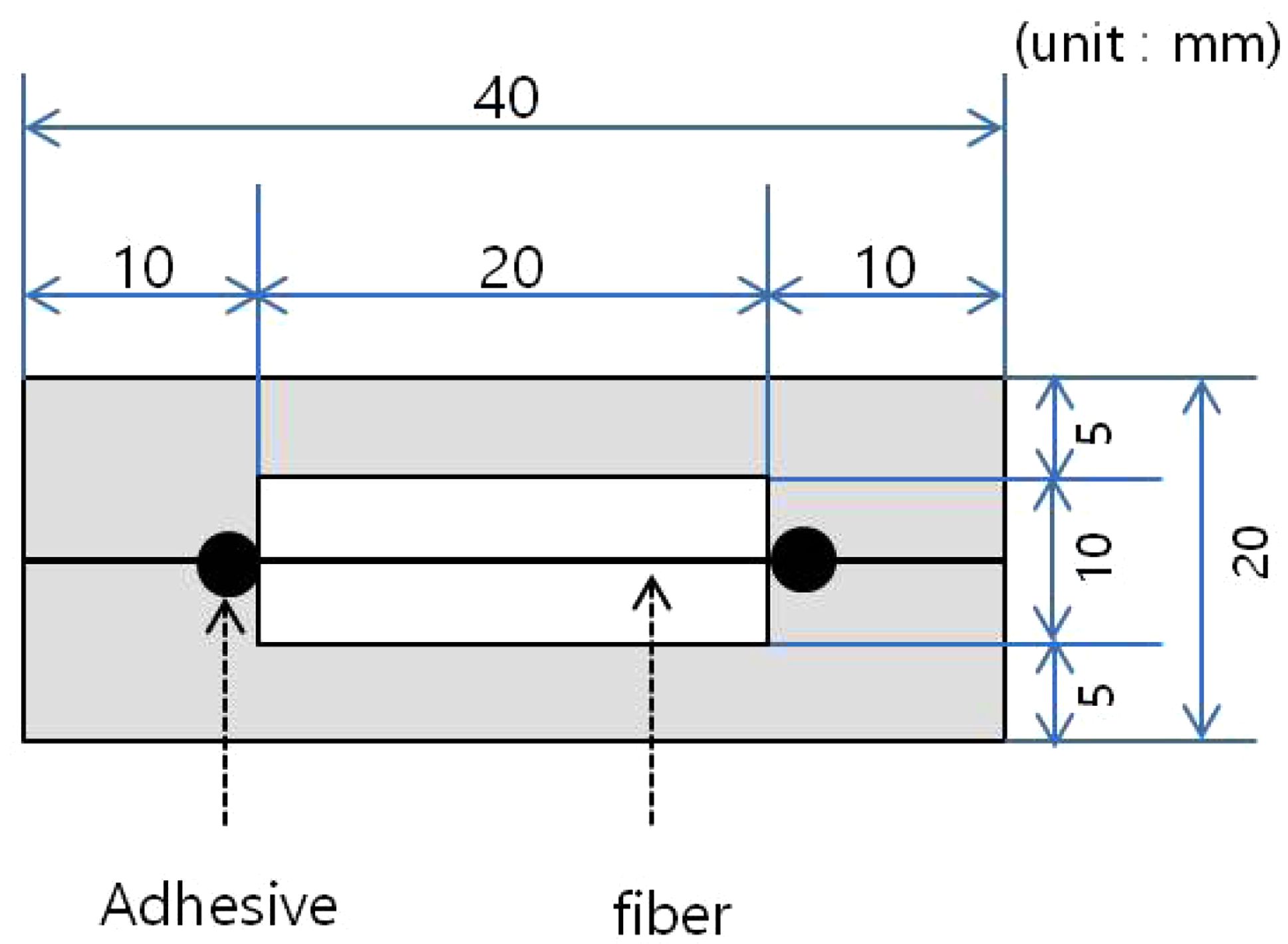 강도측정을 위하여 단섬유 물성시험기(FAVIMAT+, Textechno Co.)를 사용하였으며, 안정화/탄화 후 시료가 파단 될 때 갖는 최대하중과 신율을 측정하였으며, 최대 하중 값을 이용하여 인장강도를 구하였다. 인장강도를 구하기 위해서는 섬유의 직경을 측정해야 하는데 이는 SEM에 의하여 측정되었다. 단섬유 물성시험기의 시험속도는 2 mm/min, 시료의 길이는 20 mm, 각 시료마다 10개의 시편을 측정하였고, 그 결과는 평균값으로 나타내었다. 각 공정에서 얻은 시료들의 강도를 측정하기 위하여 인장 시험 편을 제작하여 측정하였으며, 그 시험 편은 Fig. 2와 같이 시료의 길이만큼 홈을 낸 다음에 단단한 종이 위에 섬유가 중앙에 위치할 수 있도록 반듯하게 놓은 다음에 접착제를 사용하여 양쪽을 고정하였으며, 분석 시, 종이의 양쪽을 절단하고 섬유만 힘을 받게 하여 분석하였다.