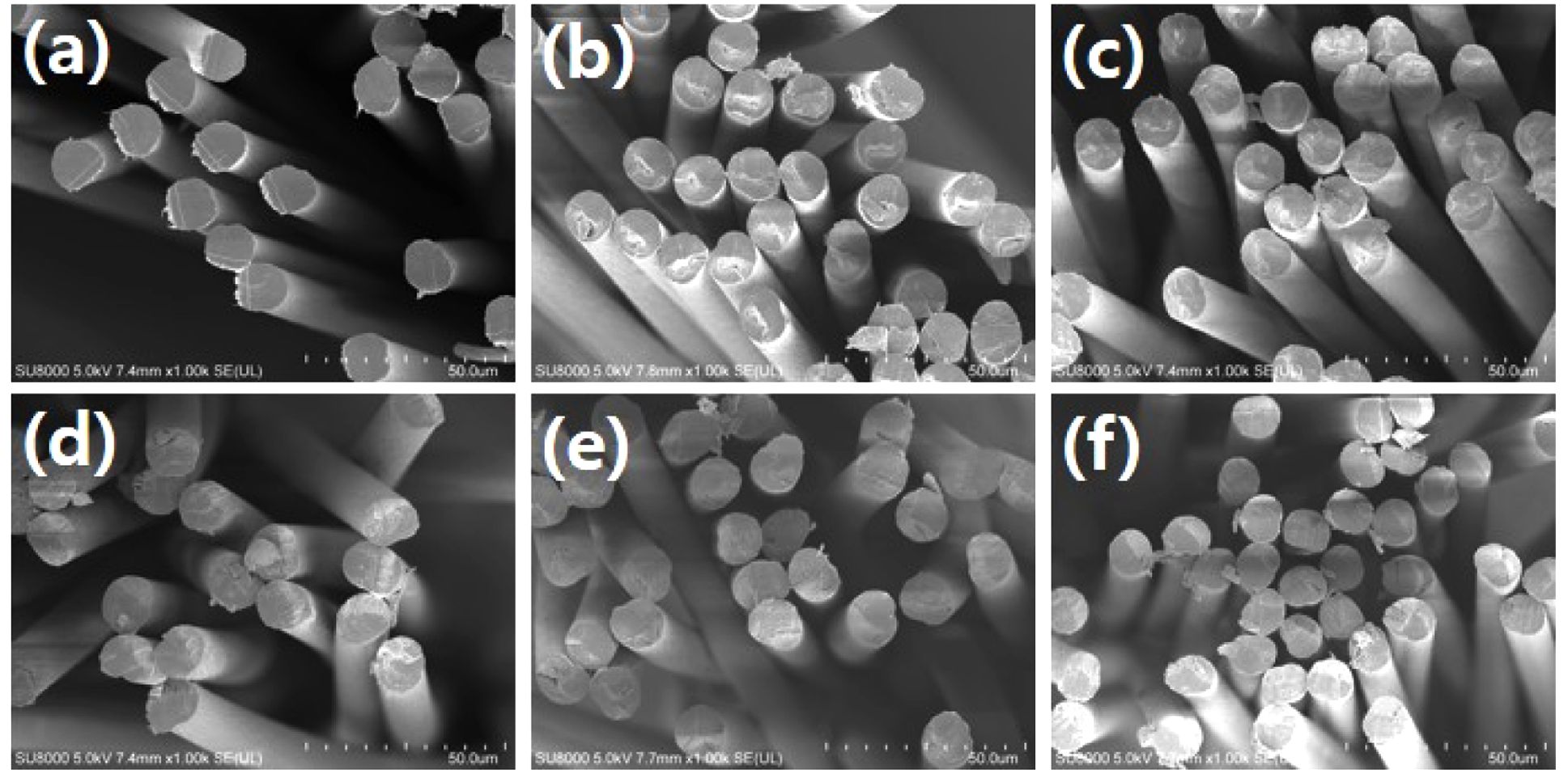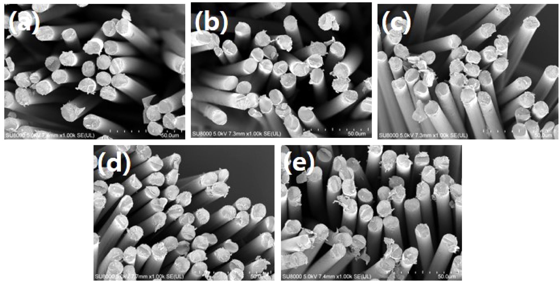 탄화공정은 분당 5oC의 속도로 상온에서 700oC까지 승온하여 1시간 유지 후, 서서히 실온 냉각되면서 진행되었으며 Fig. 4는 탄화 후의 섬유 단면의 이미지를 나타낸 것이다. 플라즈마를 도입한 안정화 공정과는 다르게 고온에 노출되면서 섬유 직경은 안정화된 PAN 섬유 대비 14% 내외의 수축이 발생하였으나 플라즈마에 의한 추가적인 수축은 발생하지 않는 것을 확인하였다. 길이방향의 수축율을 낮춤과 동시에 물리적 특성을 높이기 위하여 일정한 장력을 부여하여 탄화하였다.