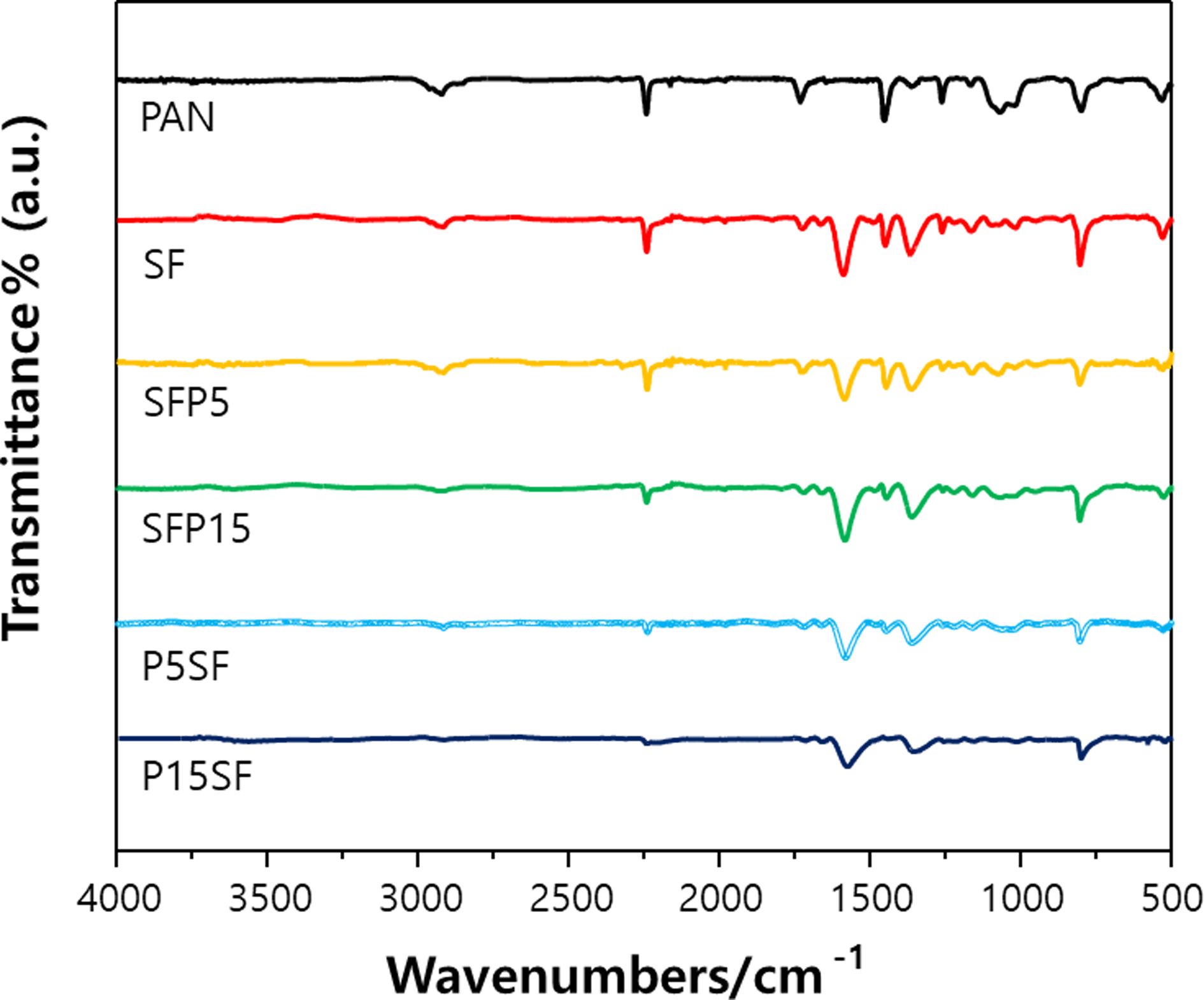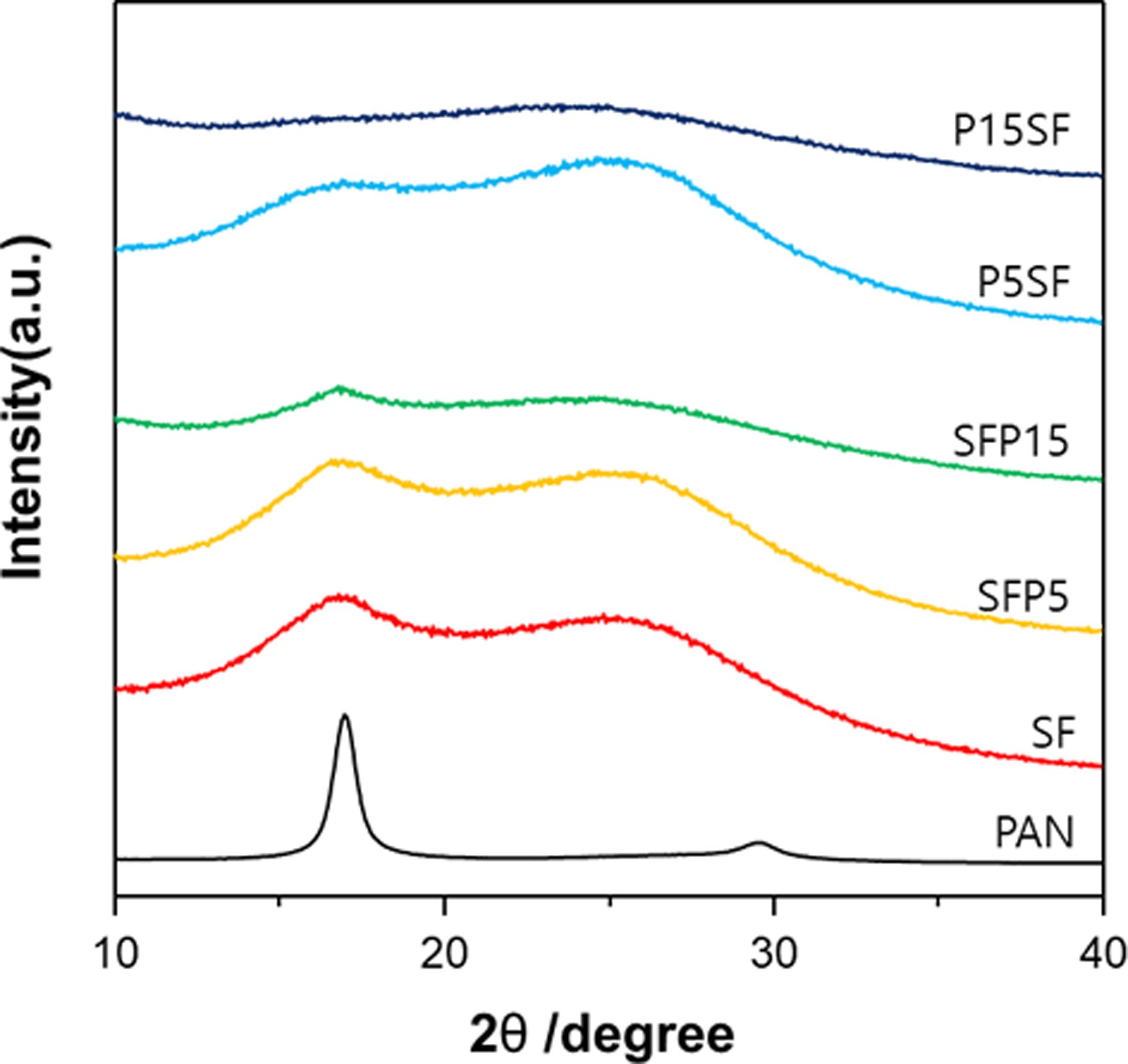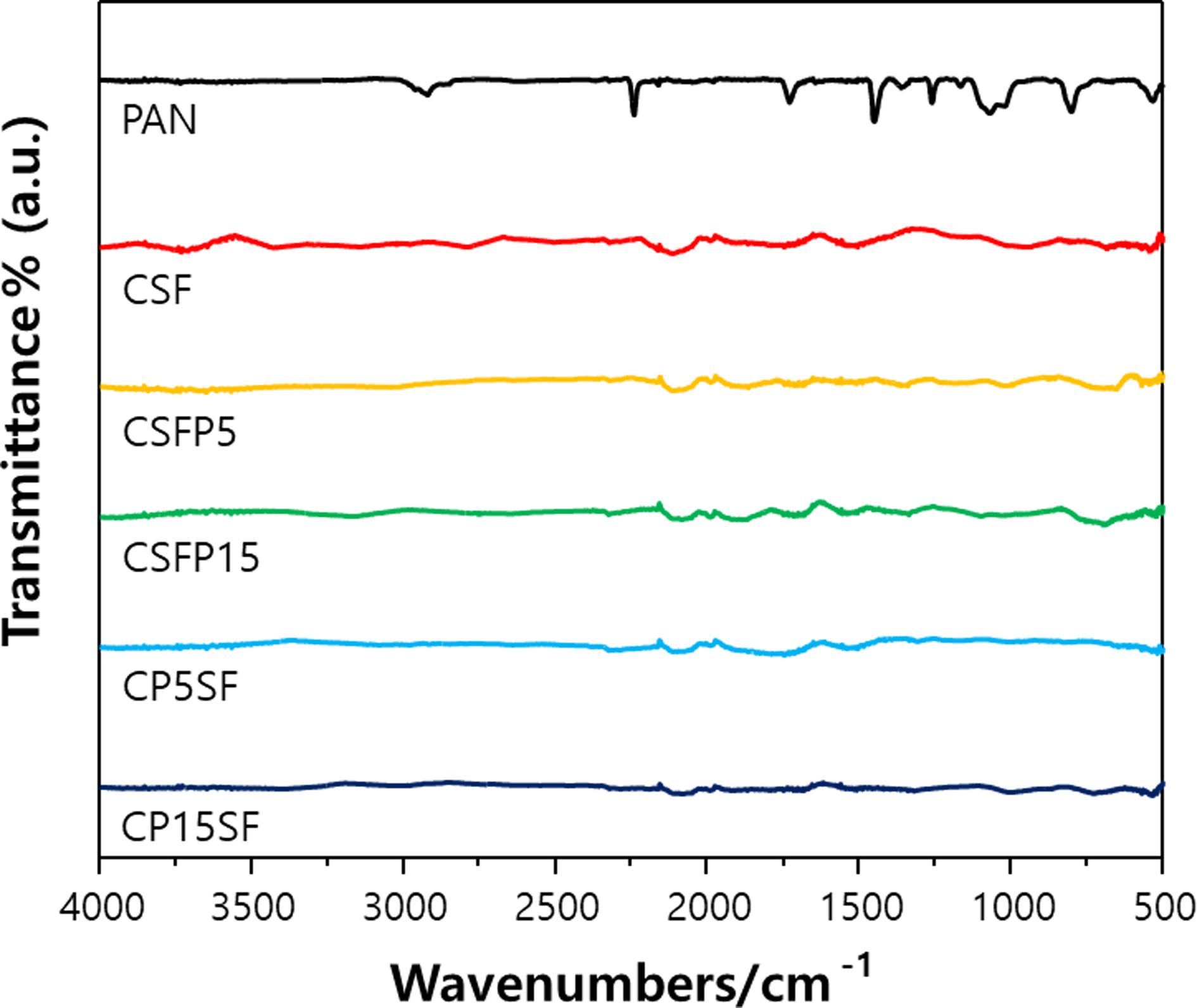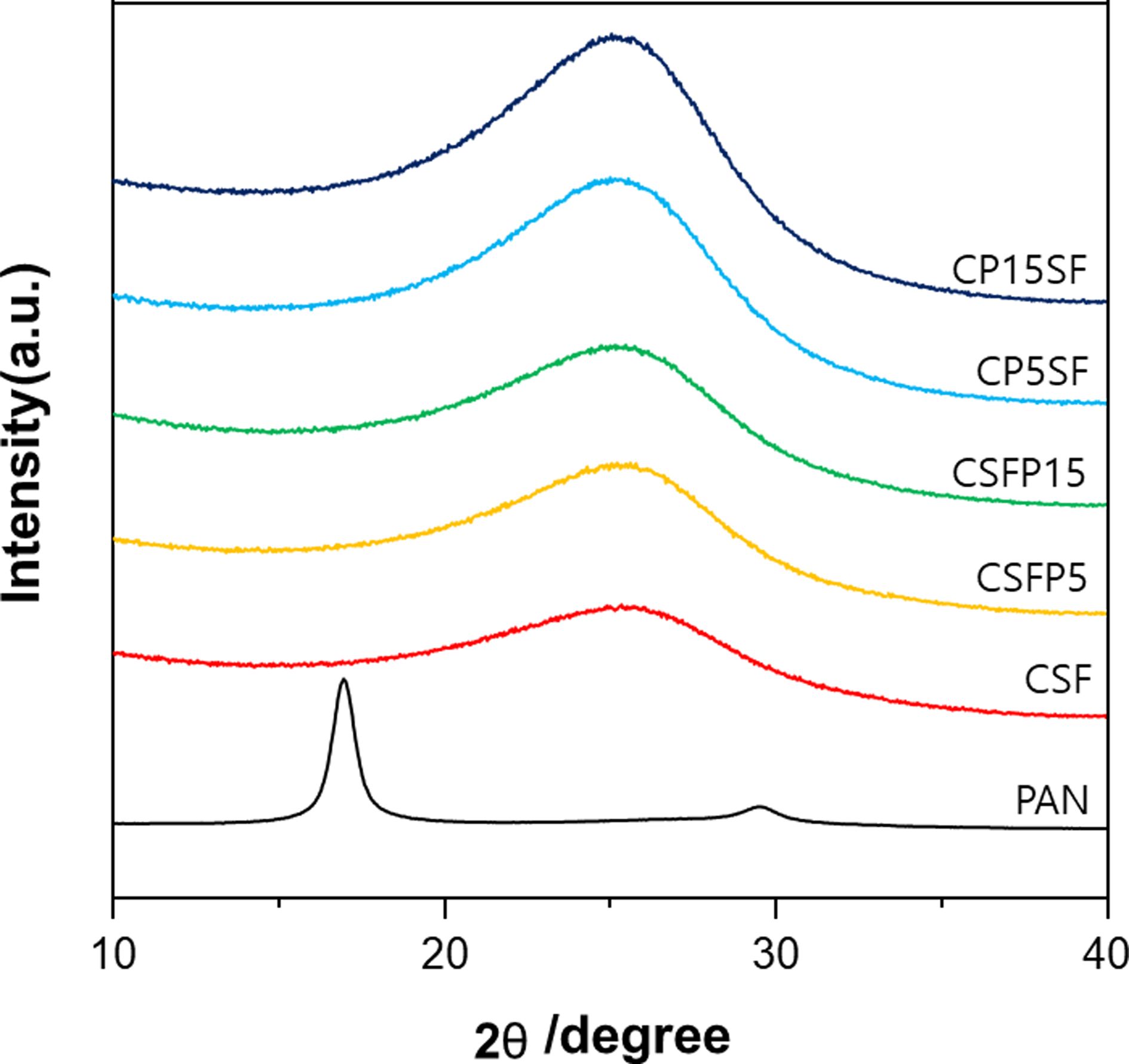안정화 처리된 시료들을 탄화하여 FT-IR 분석 결과를 Fig. 6에 나타내었다. 탄소로 이루어진 생성물은 흡광도가 매우 높기 때문에 작용기가 거의 존재하지 않는다[12]. 이는 완전하게 탄소로만 이루어진 섬유일수록 ‘ㅡ’자 형태의 그래프로 나타내는데, 시료 중에서 최소한의 작용기가 존재하는 P15SF가 이 조건에 가장 부합한 것으로 보인다.