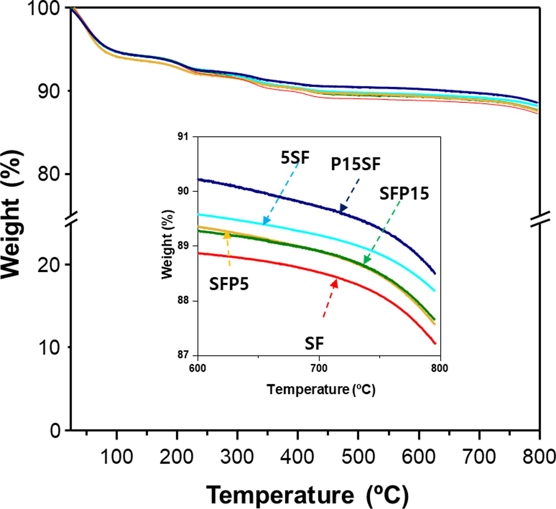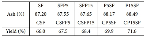 플라즈마와 열 안정화를 순차적으로 진행한 시료들과 열 안정화만 처리한 시료들의 특정온도에서의 잔류량을 확인하기 위해 열 중량분석기(TGA, Q500, TA Instruments Co.)를 이용하여 분당 10oC의 승온 속도로 N2 분위기 하에서 측정하였다.