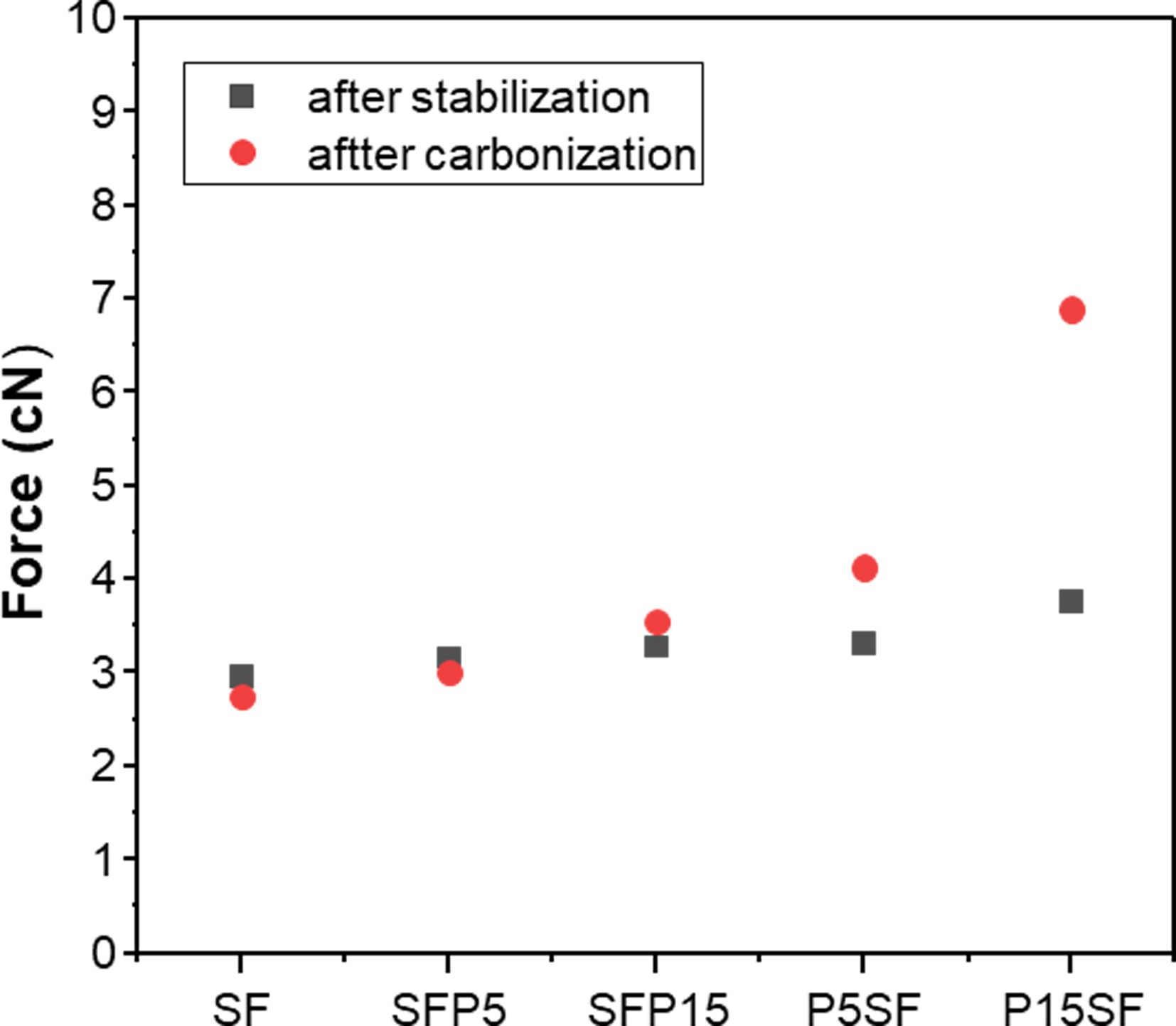 Fig. 10 Tensile force of stabilized and carbonized PAN fibers |