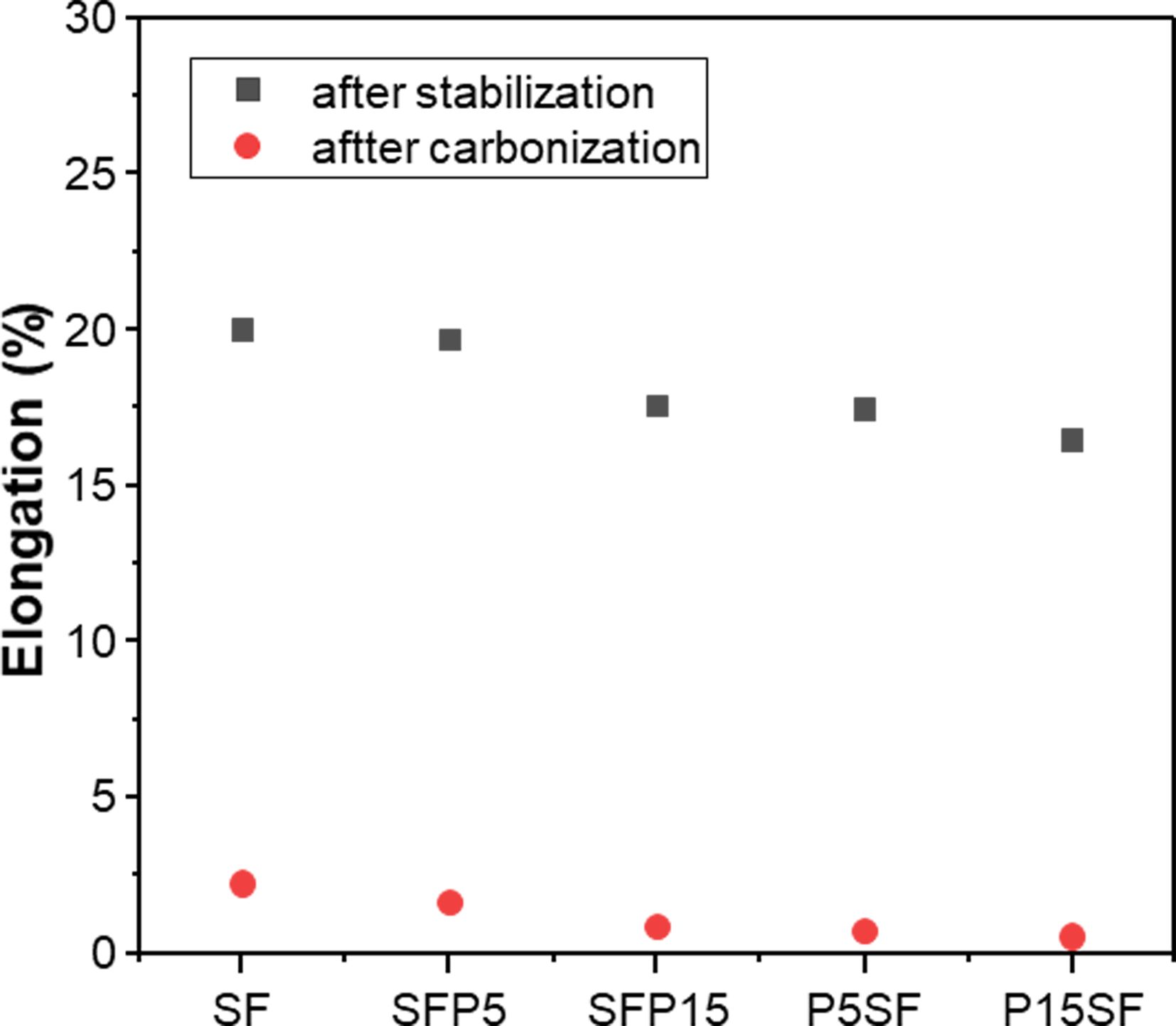 Fig. 11 Elongation of stabilized and carbonized PAN fibers |