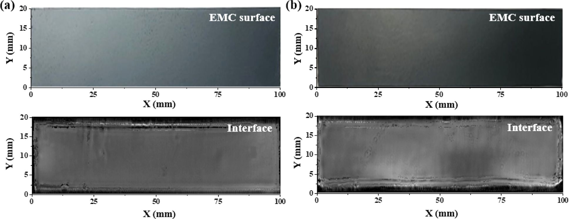 Fig. 5는 두 공정을 통해 제작한 EMC/Cu Bi-layer 패키지의 표면과 계면을 나타낸다. 두 공정 간의 EMC 표면에서는 큰 차이를 보이지 않는 것을 확인할 수 있었다. 또한, 두 공정으로 제작한 EMC/Cu Bi-layer 패키지의 계면에서 Void가 관찰되지 않았음으로 접합이 잘 이루어진 것을 확인할 수 있다.