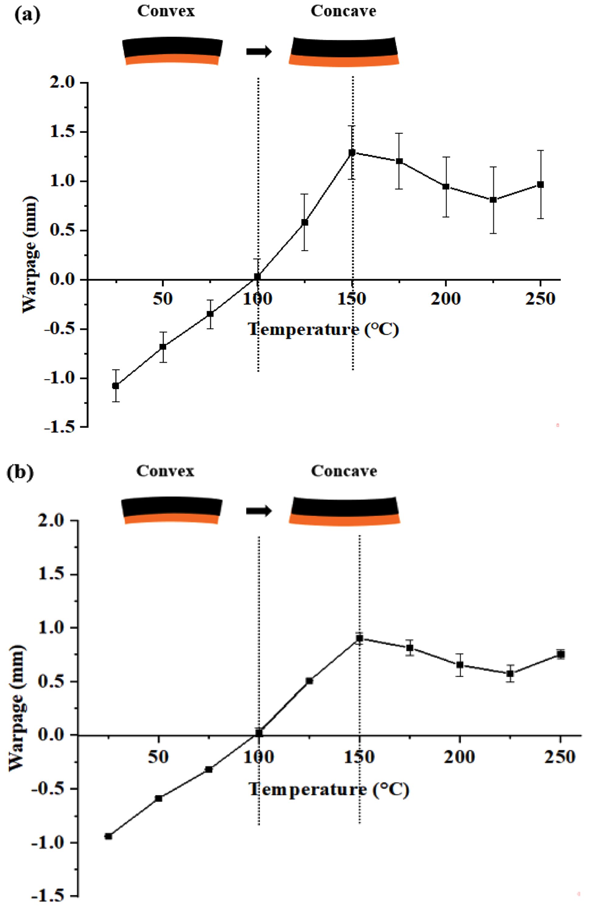 Fig. 6 Warpage of EMC/Cu Bi-layer Package according to temperature; (a) Hot Press, (b) CNT Heater |