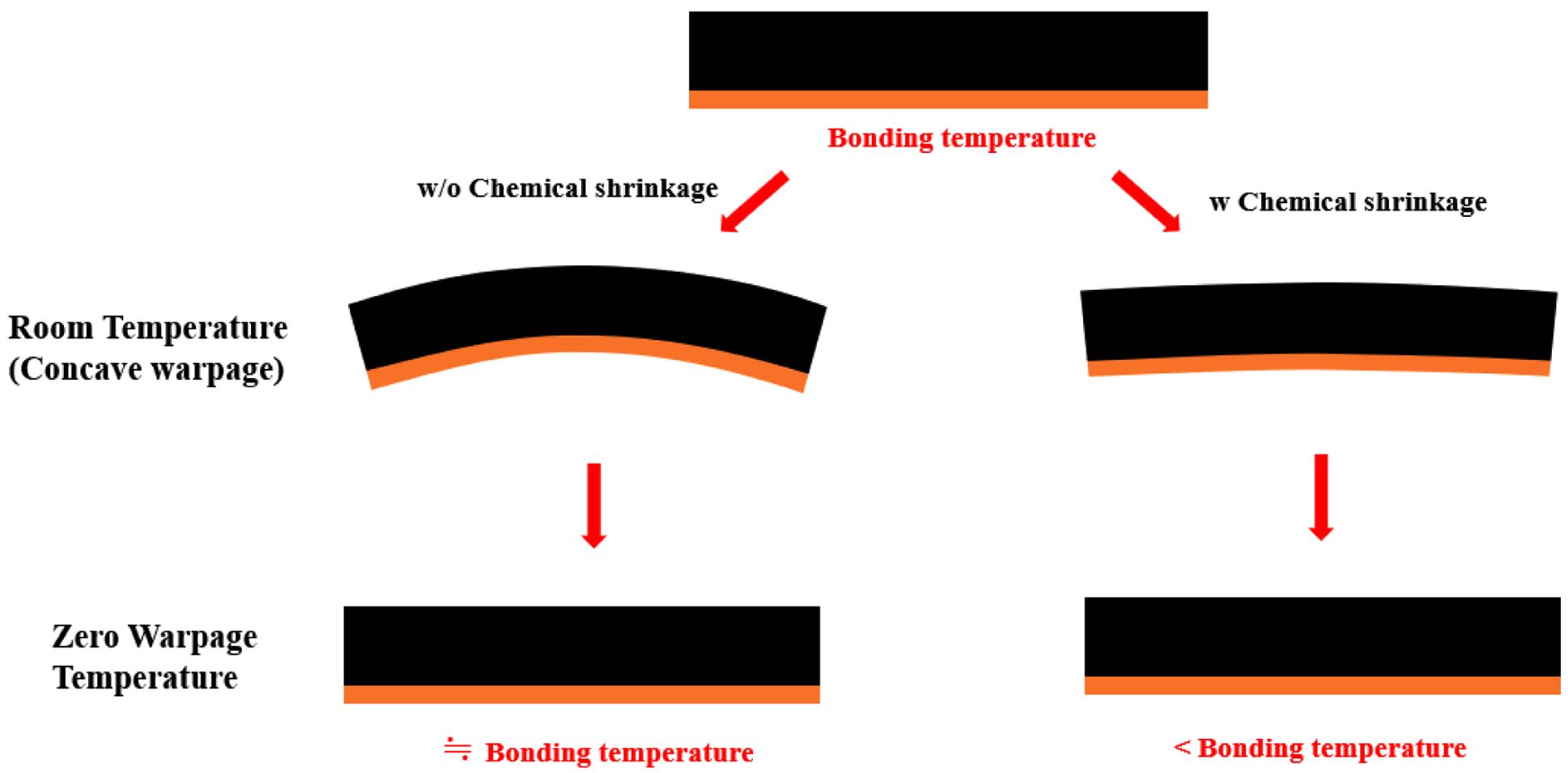 또한, Fig. 7에서 볼 수 있듯이, EMC 경화 과정 중 발생하는 Chemical shrinkage에 의해서 휨이 상대적으로 감소하여 Bonding 온도보다 낮은 온도에서 Zero 휨 온도가 발생하게 된다[9]. 추후, Chemical shrinkage를 분석하여 Bonding 온도를 분석할 예정이다.