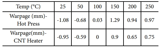 3) EMC/Cu Bi-layer Package의 휨 분석 결과, 상온에서의 Convex 휨, Zero 휨 온도, 휨 크기가 증가에서 감소로 바뀌는 온도가 두 공정 모두 동일한 것을 통해 CNT Heater를 통한 전자 패키징 공정의 가능성을 확인하였다.