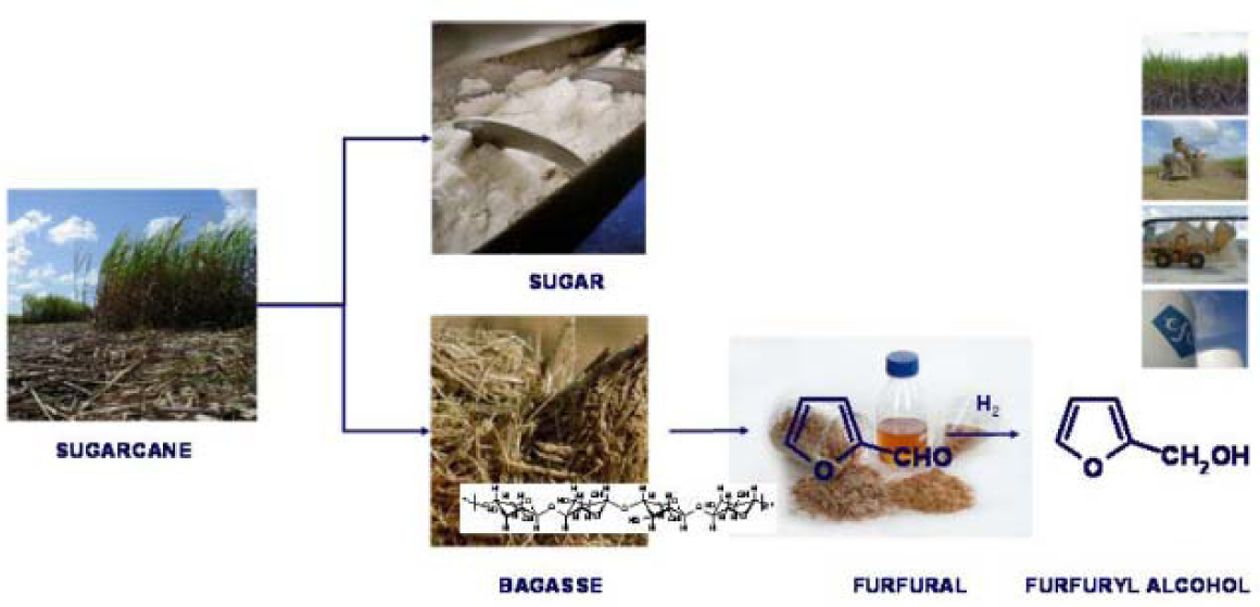 친환경 소재로 조선해양 분야에 적용해 볼 수 있는 복합재료 소재로는 퓨란 수지와 바잘트 섬유를 예로 들 수 있다. 바잘트 섬유는 현무암을 이용하여 생산하는 섬유로써 섬유의 물성은 E-유리섬유와 유사한 물성을 내며, 유리섬유보다 높은 내열성을 가지기 때문에 물성이 우수한 친환경 복합재 부품 개발이 가능하다[9,10]. 퓨란수지의 경우 보리, 옥수수와 같은 사탕수수에서 즙을 짜내고, 남은 폐기물을 산성 조건에서 가열을 통해 푸르푸랄(O-CHO)을 확보한다. 푸르푸랄은 알데하이드의 일종으로서 페놀푸르푸랄수지 등 새로운 소재로써 적용할 수 있으며, 에폭시 수지와 유사한 수지 개발이 가능해진다. Fig. 1은 퓨란수지를 제조하는 과정을 보여준다[11].