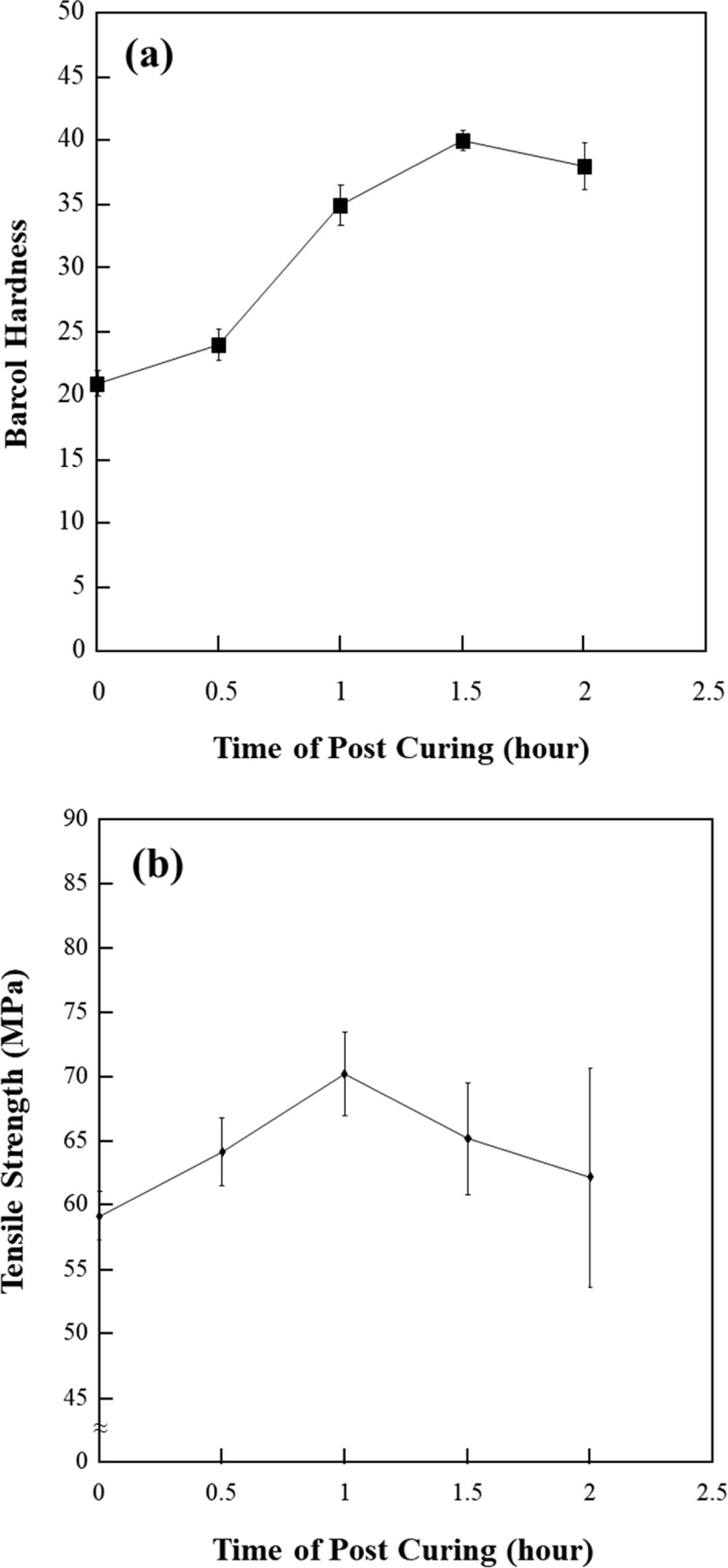 Fig. 3 (a) Barcol hardness and (b) Tensile strength of furan resin with different post curing time |