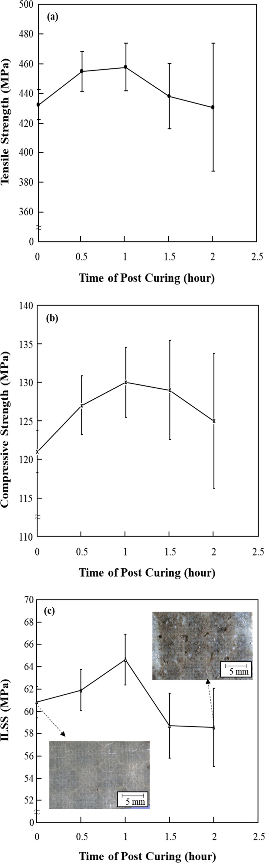 Fig. 4 Mechanical strength of BFC with different post curing time: (a) Tensile strength; (b) Compressive strength; (c) ILSS |