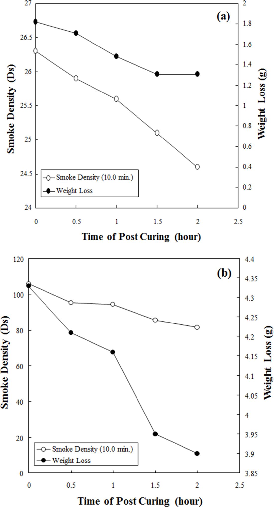 Fig. 5 Results of smoke density and weight loss of BFC with different post curing time (Amount of heat radiation: 25 kW/m2 ): (a) No ignition flames; (b) Ignition flames |