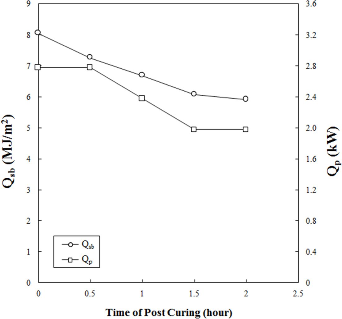 화염전파 시험은 ISO 5658-2 기준에 따라 수직 방향으로 설치된 시험체(155 mm*800 mm)의 연소 특성을 평가하였다. 시편을 가스 연소식 복사 패널에 의해 공급되는 복사열 분포장에 노출시켜 연소하여 측정한다. 연소 지속열(Qsb, MJ/m2)과 총열방출량(Qp, KW)을 이용하여 후경화 조건에 따른 소재의 특성을 확인했다.
