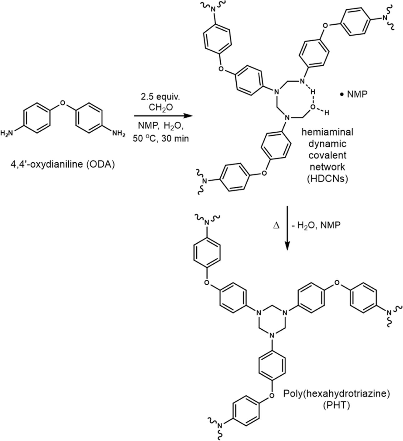 본 연구에서 사용된 poly(hexahydrotriazine) (PHT)의 합성 과정을 Fig. 1에 제시하였다. Diamine과 formaldehyde의 중축합 반응을 통해 HDCNs (hemiaminal dynamic covalent networks)이 형성되며 추가 가열되면 코어 고리에서 NMP와 물이 제거되어 hexahydrotriazine 구조의 반복으로 구성된 PHT가 형성된다[28].